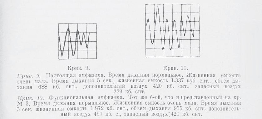 Необходимо еще раз отчетливо указать на то, что работоспособность больного зависит в первую очередь от субъективного чувства одышки и лишь во вторую очередь, особенно когда ему приходится производить тяжелую работу, оказывает свое влияние количественное содержание СО2 и О2 в крови. Таким образом происходит то, что больной с настоящей эмфиземой и очень плохим дыханием при известных обстоятельствах в состоянии выполнять легкую работу, в то время как б-ой с функциональной эмфиземой при одинаковой или даже лучшей кривой дыхания может быть полным инвалидом. Кривые №№ 9 и 10 объясняют это более демонстративно.