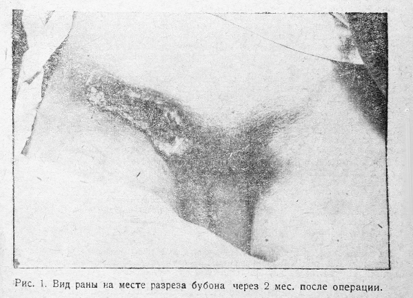 В хирургической клинике им. Вишневского сделан разрез бубона, выделилось значительное количество серозно-гнойной кровянистой жидкости. В образовавшуюся после разреза рану вставлена турунда.