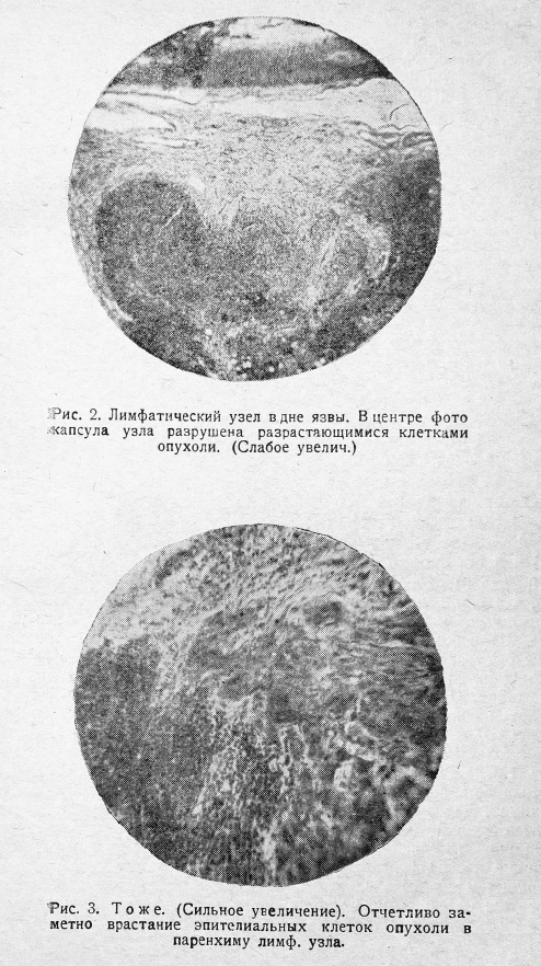 2-й случай. Больной 56 лет, в анамнезе сифилис. В августе 1922 г. припухла, паховая лимфатическая железа, температура высокая, кожа над припухшей железой воспалена. Был сделан прокол, получили мутную серозно-гнойную жидкость. Было назначено соответствующее лечение. В дальнейшем острые воспалительные явления стихли и I/XII 1922 г. больной с диагнозом 4-й венерической болезни был направлен в хирургическую больницу. Д-р Ieanne удалил пораженные железы. Одна из удаленных лимфатических желез была послана для гистологического исследования д-ру Payennevill’ю, который на основании данных гистологического исследования поставил диагноз рака, причем отметил, что раковые клетки врастают в железу из эпидермиса.