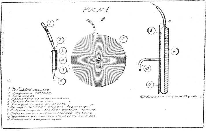Вместо микроконденсаторной камеры мы изготовили плоскую стеклянную спираль из стеклянного цилиндрического капиляоа с наружным диаметром в 2 мм и внутренним диаметром в 1 мм. Диаметр поверхности такой спирали был равен 15 сантиметрам и соответствовал диаметру конденсаторной пластинки (см. рис. 1 Ь, с).