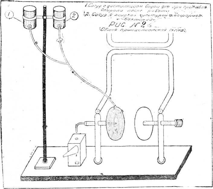 Разумеется, если работать в затемпенном помещении (что мы очень рекомендуем), надобность в вышеописанной камере отпадает. Практическое применение сконструированного нами микроконденсатора сводится к следующему. В обычное конденсаторное поле помещается соответствующий объект для исследования, к одной из пластин конденсатора прикрепляется описанная выше микроконденсаторная камера. Пластины конденсатора настраиваются обычным способом с таким расчетом, чтобы через, каждые 5 секунд одна капля фосфоресцирующей культуры, протекающей через микроконденсаторную камеру, теряла бы свечение при этих условиях.. Это нами было принято за одну единицу биологической дозы ультракоротких волн.