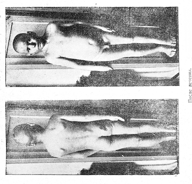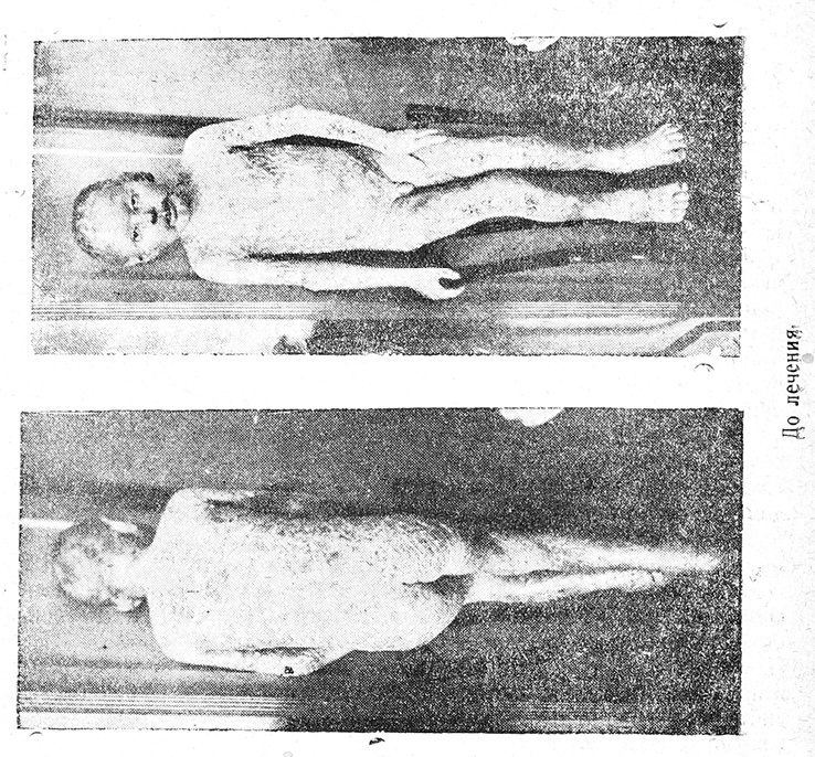 Больной К., 11 лет (фот. снимки до и после лечения). По рассказу матери, болен с 9-месячного возраста. Больной в прошлом беспрерывно лечился разными мазями, лекарствами безрезультатно. При поступлении в клинику вся кожа сплошь красна*и покрыта пластинчатыми чешуйками, лицо и волосистая часть головы— с себоройным налетом. Кожа туловища стянута, больной не может выпрямиться (стоит согнувшись). Не в состоянии вытянуть руки; обращает на себя внимание недоразвитость половых органов, у больного penis и яички очень малы (яички величиной с лесной орех). После инъекции гравидана, через день по 1 см3, наступает улучшение, чувство стягивания кожи уменьшается. Для ускорения излечения больному применяются ванны через день и ежедневные смазывания борным вазелином.