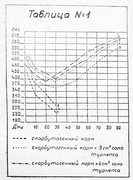 Наконец, 3-я пара — скорбутогенный корм плюс 6 см3 сока турнепса (табл. 1, №№ 5 и 6).