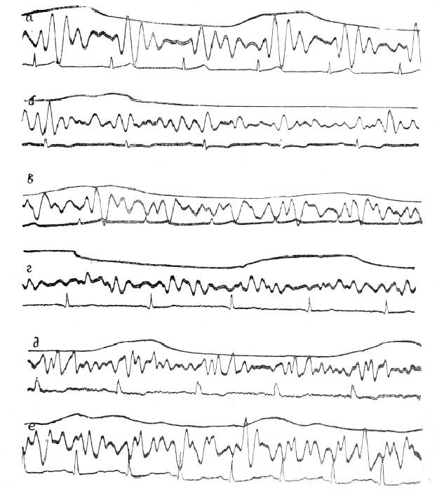 На всех кривых: сверху вниз 1) отметка времени; 2) дыхание, 3) баллистокардиограмма, 4) электрокардиограмма.