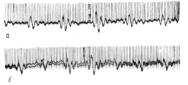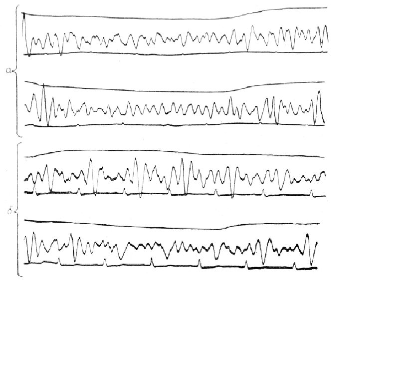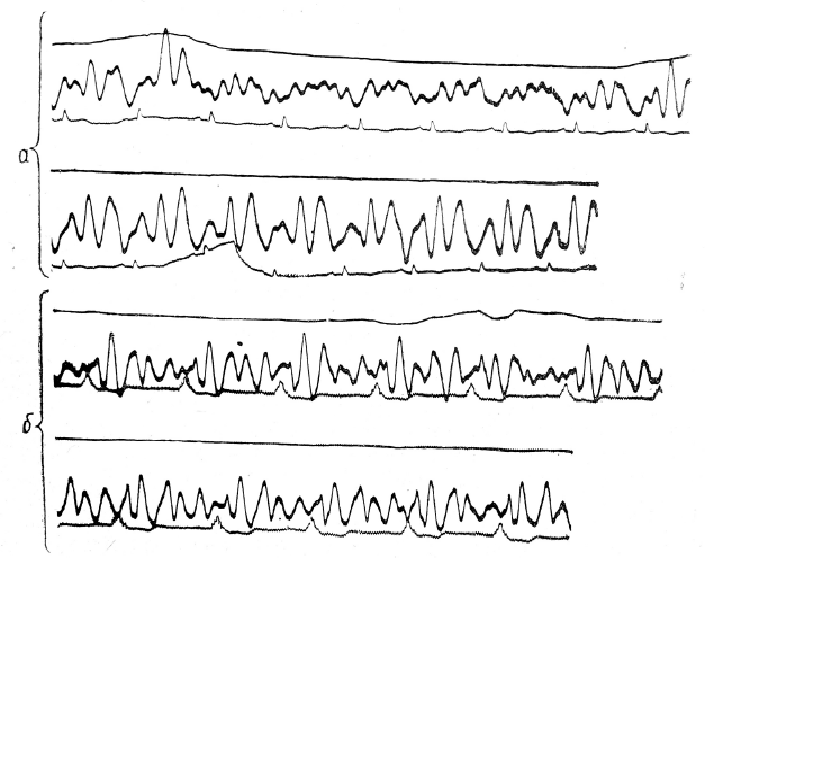 Весьма характерными для больных с коронарной недостаточностью считаются дыхательные колебания БКГ. Наши наблюдения так же показали значительную частоту и выраженность изменений БКГ в различные фазы дыхания. Как видно на рис. 2 (а), эти колебания выражались резким снижением амплитуды и усилением деформации систолических комплексов на выдохе. Наряду с этим, важно отметить, что у 18 больных с явными патологическими изменениями БКГ дыхательные колебания кривой были весьма незначительны, а у 5 больных отмечены даже прогрессирующее снижение и ухудшение комплексов в фазу вдоха. Иллюстрацией являются примеры, приведенные на рис. 2 (б) и рис. 1 (г, д). Наши наблюдения не подтвердили полностью литературных данных относительно улучшения БКГ при задержке дыхания. Улучшение было отмечено только у 26 больных инфарктом миокарда. Достаточно часто встречалось даже ухудшение кривой при задержке дыхания (рис. 2, б).