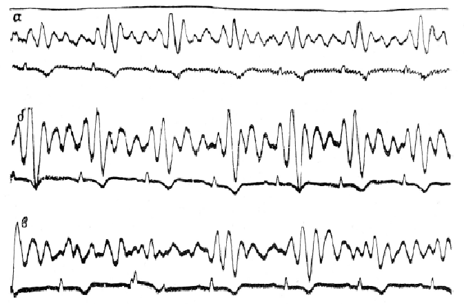 Степени нарушений дифференцируются следующим образом: при первой степени более половины комплексов нормальны, самые большие волны в два раза превышают наименьшие, причем последние могут быть нормальными или измененными. При второй степени более половины комплексов относительно малы и амплитуда минимальных комплексов может быть меньше Ѵ3 максимальных волн IJ во время вдоха. Некоторые из малых комплексов могут иметь отклоняющийся от нормы вид. При третьей степени нарушений все комплексы малы и более половины имеют причудливый вид или настолько искажены, что дифференцировать отдельные волны на них не представляется возможным. При четвертой степени нарушений все комплексы малы и не имеют типичных волн. Диастолические зубцы имеют такую же или даже большую амплитуду, чем систолические.