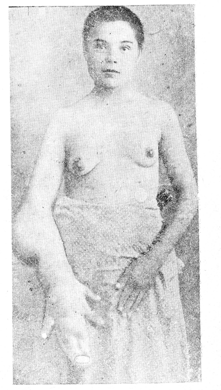 Нижние конечности б-ной без особых отклонений. Надбровные дуги хорошо выражены. Зубы на нижней челюсти расположены редко, с промежутками. Язык имеет слегка увеличенные размеры. Внутренние органы без особых изменений. Щитовидная железа прощупывается, не увеличена. Растительность на лобке выражена умеренно, по женскому типу. Грудные железы достаточно развиты, правая заметно больше левой; околососковый пигментированный кружок правой грудной железы имеет в диаметре 5 см, левой—3 см. Менструации у больной начались будто бы лишь в течение последнего года, длятся по 3—4 дня, безболезненны. Длительности межменструального периода больная определить не может. За время пребывания в больнице месячные наблюдались два раза, с промежутком почти в 11/2 месяца.
