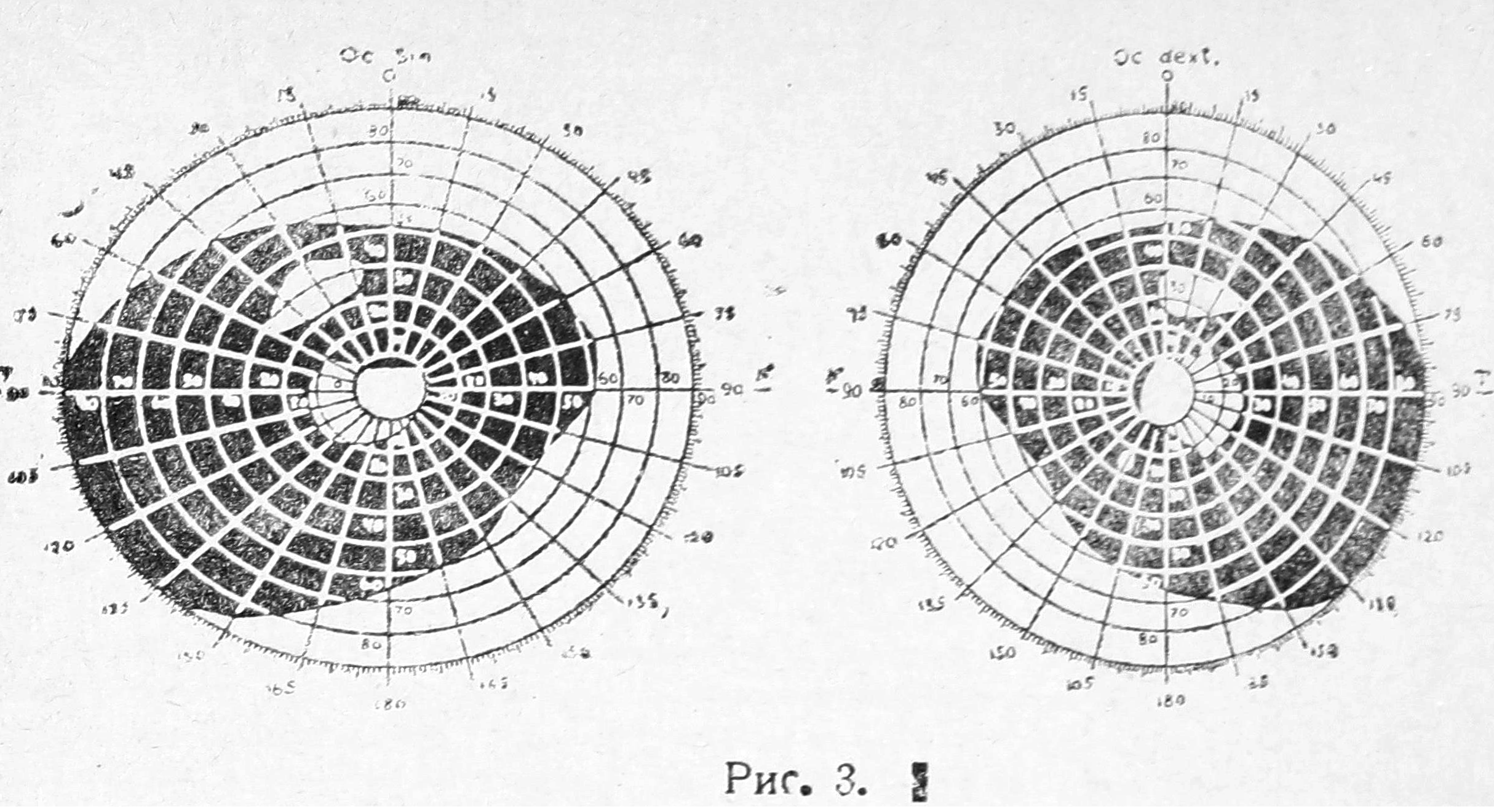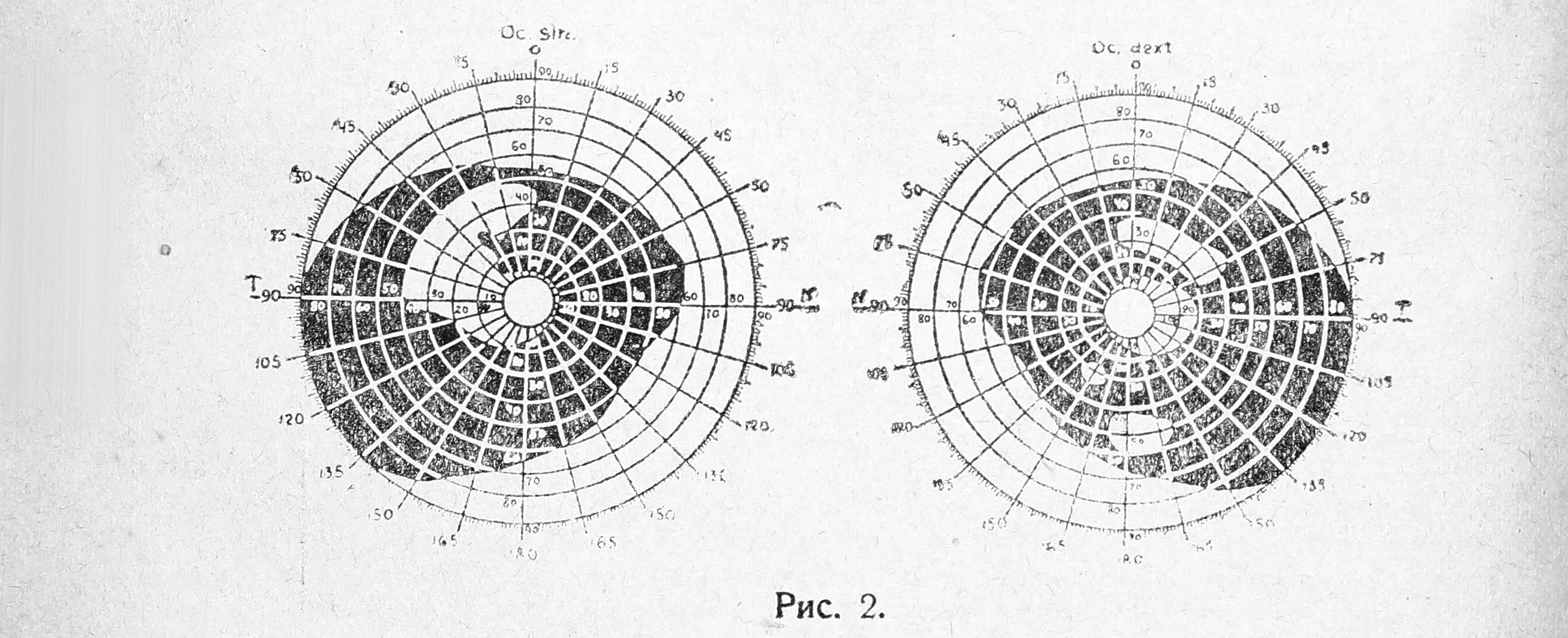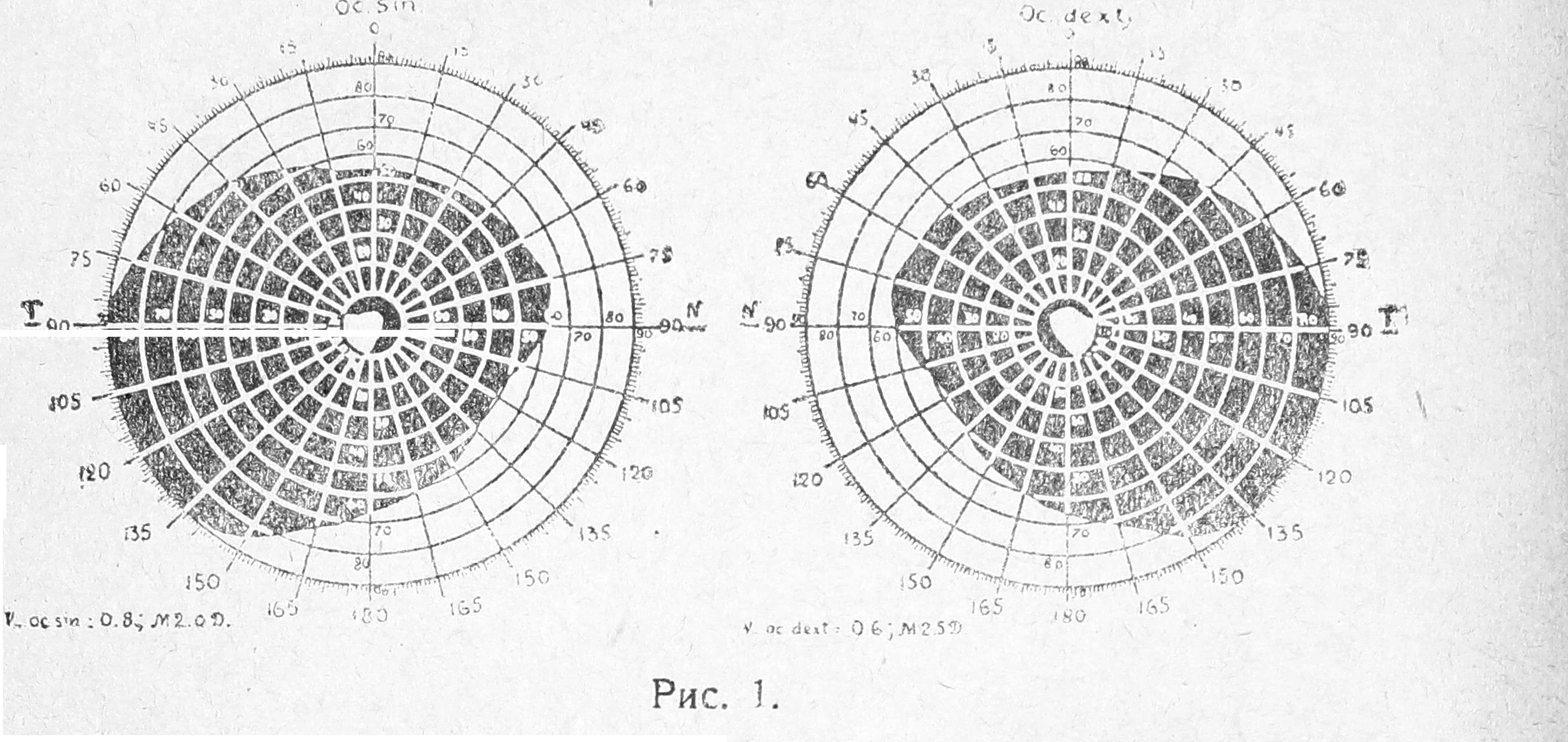 До 1932 года больная подвергалась обычным методам терапии (стрихнин, дионин, КЛ и т. д.) без заметного успеха. В 1932 году применены амбулаторно с терапевтической целью вдыхания амил-нитрита. В этой серии наблюдений за больной основное внимание было уделено тщательным исследованиям поля зрения, как индикатору. До начала лечения поле зрения, многократно исследованное, представлялось весьма узким (рис. I).