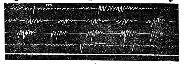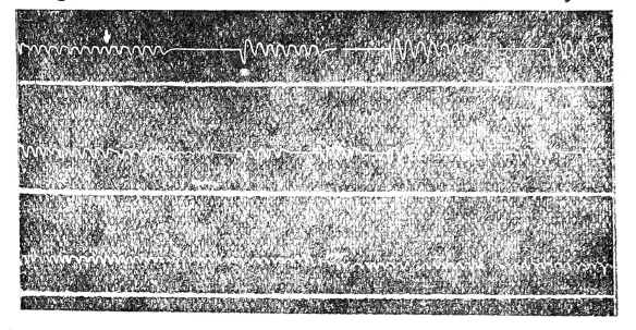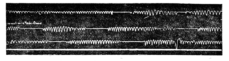 Кривая 4. Испыт. Ш. Ритм Чейн-Стокса воспроизведен путем последовательного сочетания отрицательных и положительных речевых приказов (верхняя кривая). Самостоятельный периодический ритм Чейн-Стокса (средняя кривая). Устранение периодического ритма соответствующим внушением (нижняя кривая).