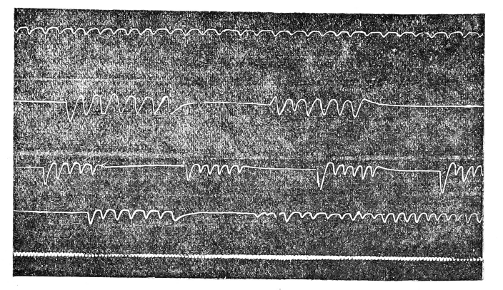 Кривая 1. Испыт. О. Невыполнение речевой инструкции (верхняя кривая, справа). Ритм Чейн-Стокса после повторного внушения (2-я кривая). Постгипнотическое сохранение периодического ритма (3-я кривая). Пробуждение (нижняя кривая). Внизу отметка времени в секундах.