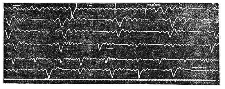 В указанной группе исследований также не удалось отметить разницы в реакции дыхания на внушение при средней силе гипноза, по сравнению с случаями глубокого гипнотического сна.