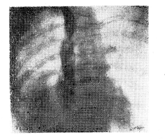 Рис.2 Селективная ангиограмма левого легкого при ТВС. В верхней доле хорошо видна каверна. нарушение кровоснабжение верхней доли. нормальный сосудистый рисунок язычка и нижней доли.