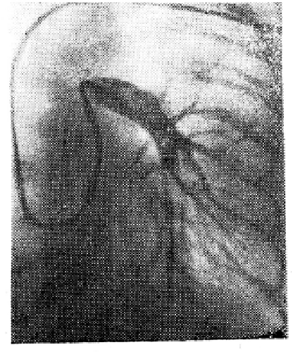 Ангиография проводится после полного клинического исследования больного и обязательно до бронхографии, так как задержка йодлипола в бронхах мешает правильной трактовке сосудистых изменений. За день до исследования производится йодная проба (введение кардиотраста, диодона) и проводится беседа с больным. На ночь дается 0,05 амитала натрия. Специальной премедикации мы не проводим. Методика зондирования общеизвестна. Необходимо только отметить, что проведение зонда в различные ветви легочной артерии требует определенного навыка. Обычно зонд проходит в правую нижнюю ветвь. легочной артерии. Для того, чтобы провести зонд в верхнедолевую артерию, необходимо выдвинуть зонд до места деления правой ветви и затем очень медленно продвигать его по верхней стенке правой ветви Таким образом удается провести зонд в верхнюю ветвь. Однако в случае неудачи, если после 2—3 попыток провести зонд не удается, надо установить зонд тут же за правым краем позвоночника до места деления правой ветви легочной артерии на долевые ветви. Таким путем достигается хорошее изображение верхней доли.