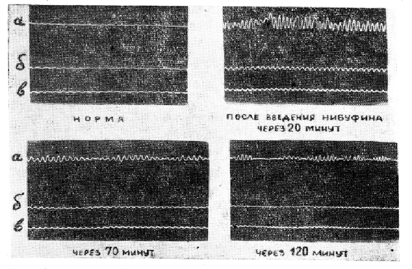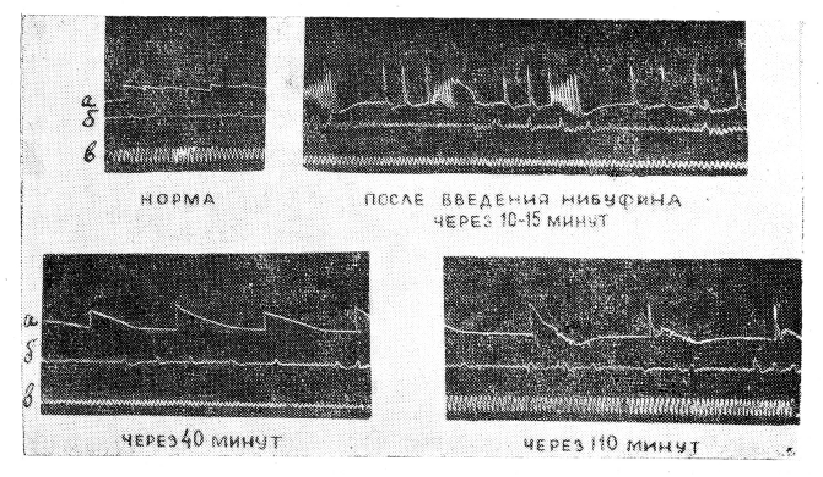 Во всех своих опытах мы установили усиление перистальтики мочеточников. При этом у животных эффект наступает как при внутривенном, так и при внутримышечном введениях нибуфина.