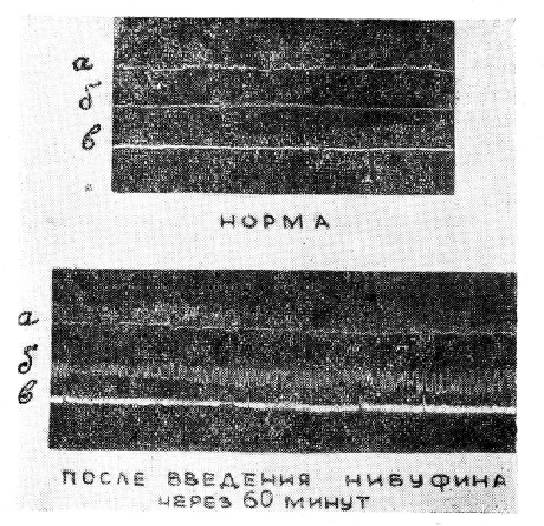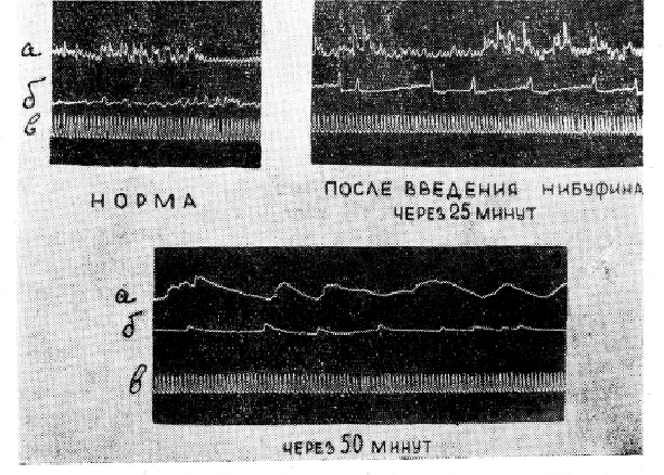 Рис.1 Влияние нибуфина на моторику мочеточников. Сверху вниз: а — сокращения правого мочеточника; б — сокращения левого мочеточника; в — запись дыхания.