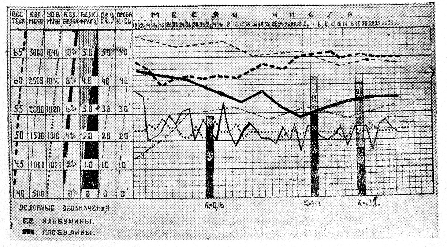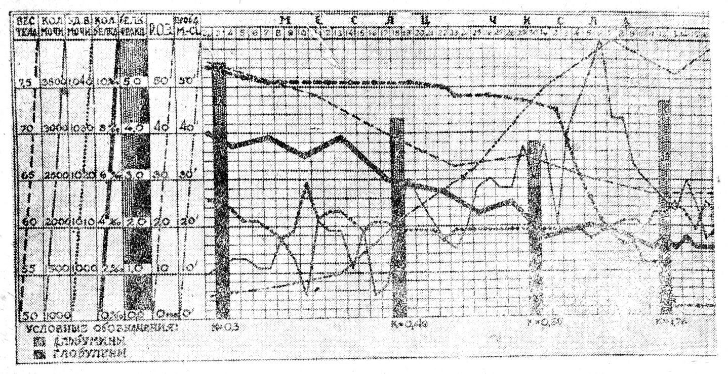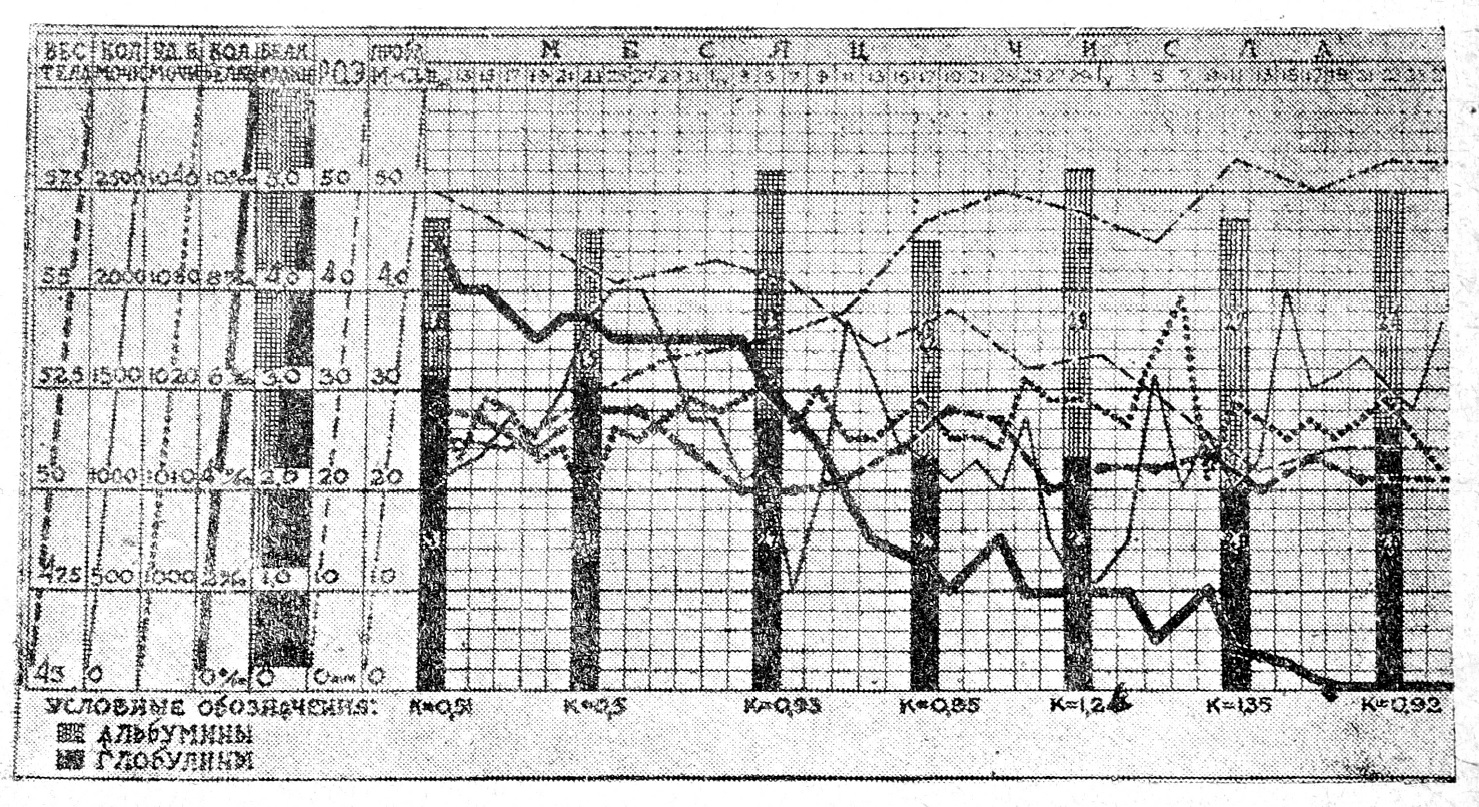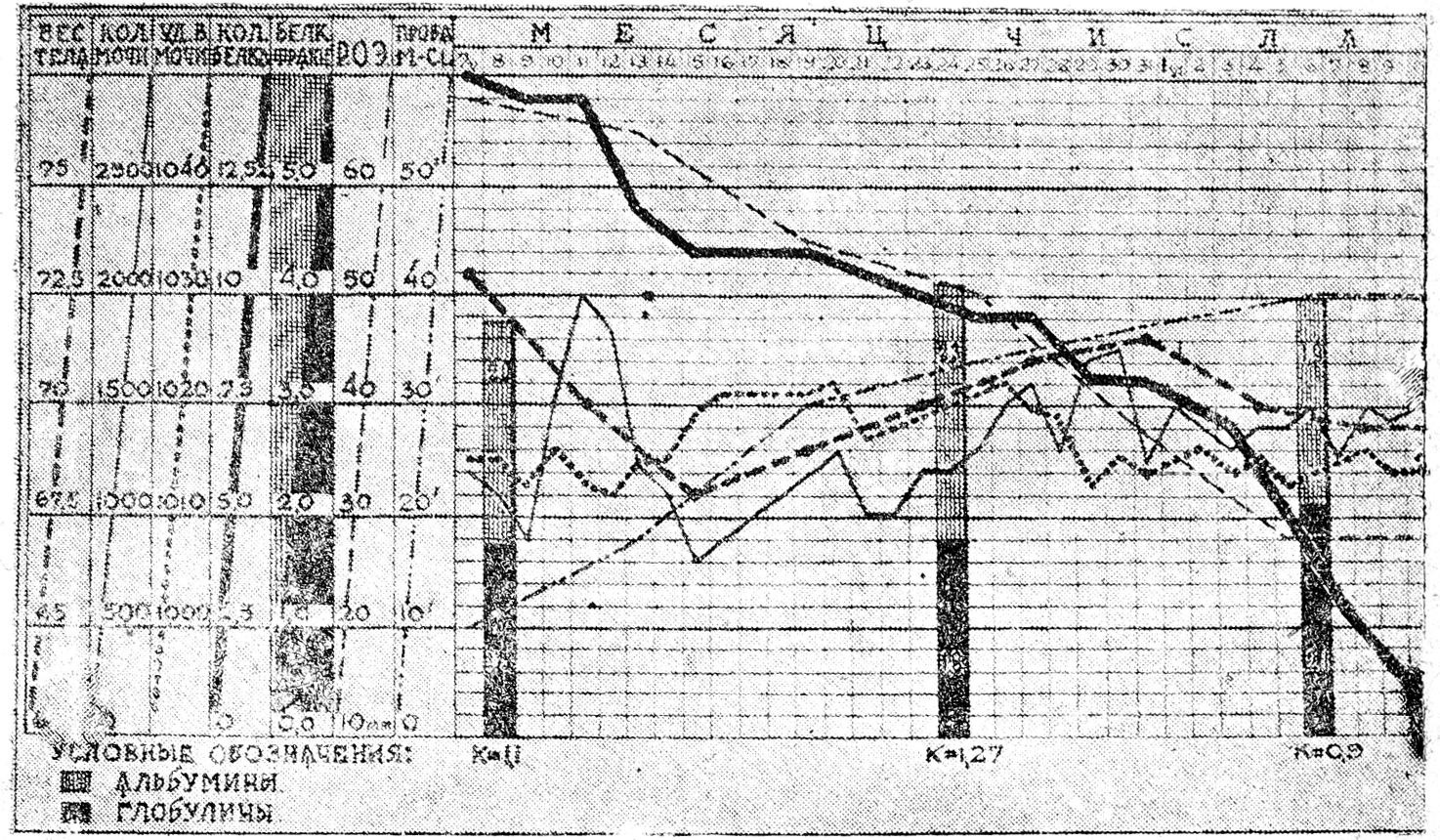 Наблюдения над белковым питанием больных с гипальбуминозными отеками, с нефротическим синдромом, производившиеся в клинике Стражеско, а также Тареевым (доклад на XII Всесоюзном съезде терапевтов) — согласно говорят как об увеличении общего, белка сыворотки крови (количество циркулир. белка у Тареева), так и о качественных сдвигах в смысле нарастания альбуминов и снижения глобулинов. Вес тела уменьшался за счет повышения общего диуреза. .