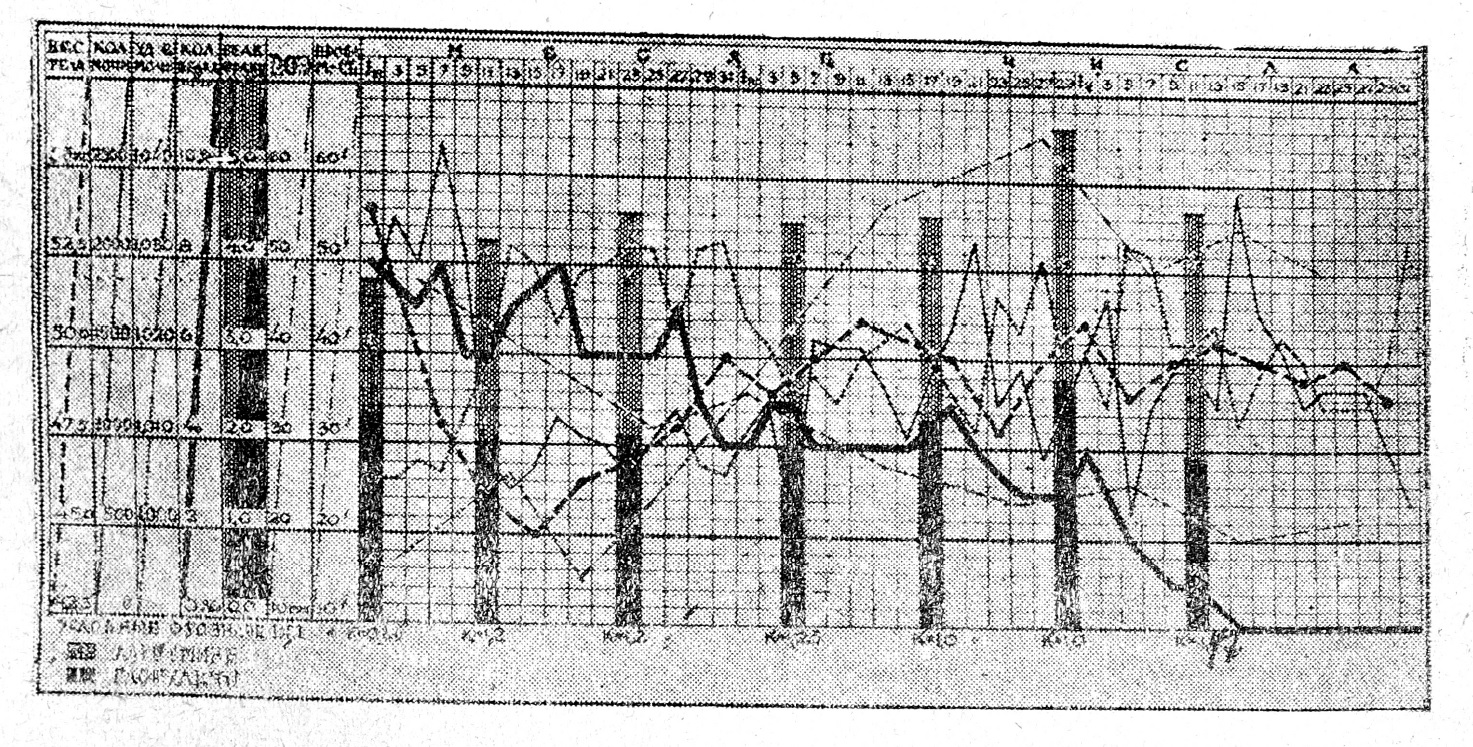 В виду того, что б-ной обнаруживал крайне торпидное течение и за время в 50 дней дал снижение белка в моче только на 2,5‰, ему была назначена белковая диета с двойным содержанием белка (237,0). Из диагр. 7 видно, что под влиянием такого обильного белкового режима количество белка в моче вновь стало заметно повышаться. Б-ной выписался с небольшими отеками на ногах. Обращает внимание значительное улучшение белкового состава крови.