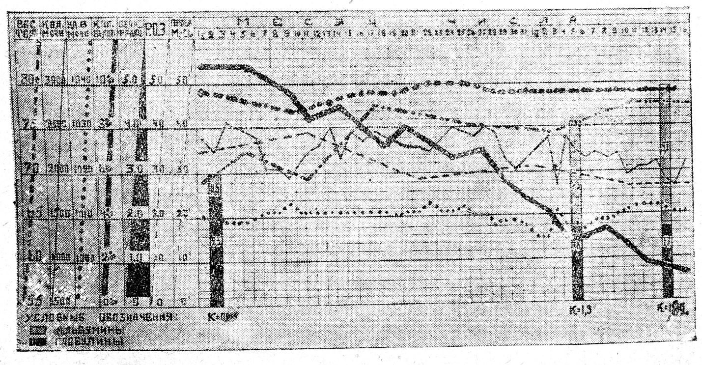 Динамика показателей: веса тела, количества мочи и удельного веса, белкового состава крови, РОЭ и пробы Мак Клюр и Олдрича представлены в диаграмме 1.