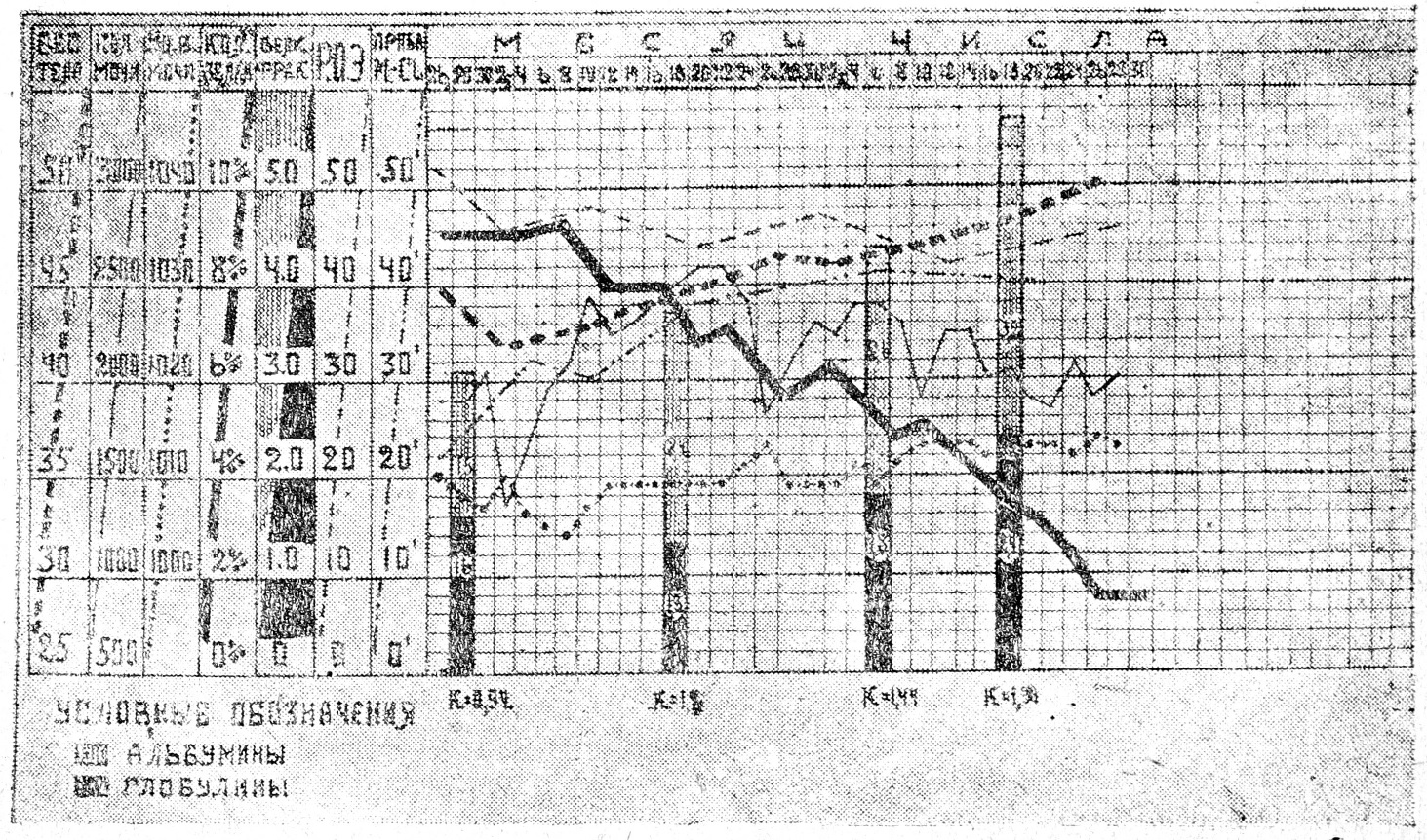 Больной выписался с улучшением общего состояния, без отеков, с увеличением общего количества эритроцитов в крови и гемоглобина. Белок в моче упал с 12‰ до 1,6‰, слегка замедлилась РОЭ. Наступило увеличение белка в сыворотке крови и резкое нарастание альбумина.