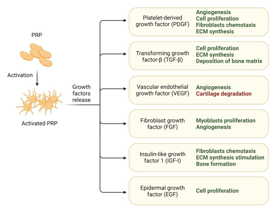 At the same time, high concentrations of some growth factors may have an opposite effect on cartilage regeneration. For example, VEGF, a vascular endothelial growth factor present in PRP, stimulates the growth of new vessels, attracts immune cells, and may contribute to the development of chronic osteoarthritis at certain stages of the disease [18].