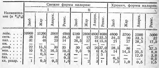 Для клинических целей в исследовании лейкоцитарной картины (л. к.) важно учитывать, что „картина крови не является специфическим симптомом определенных заболеваний, а представляет собой преходящее патологическое изменение состояния равновесия системы крови" (Шиллинг). Приступив к изучению л. к. при малярии (м.), мы имели в виду отметить в ней, помимо количественных колебаний, те морфологические изменения, которые дает м. в периоде острых приступов и которые с большой осторожностью могли быть перенесены на наиболее трудные в диагностическом отношении латентные формы м. С этой целью, мною по предложению проф. Н. К. Горяева было проведено гематологическое наблюдение над маляриками 110 инфекционной б-цы (1934—35 г.), и позднее (1938—39 г.) эти наблюдения были продолжены в клинике проф. А. Ф. Агафонова.