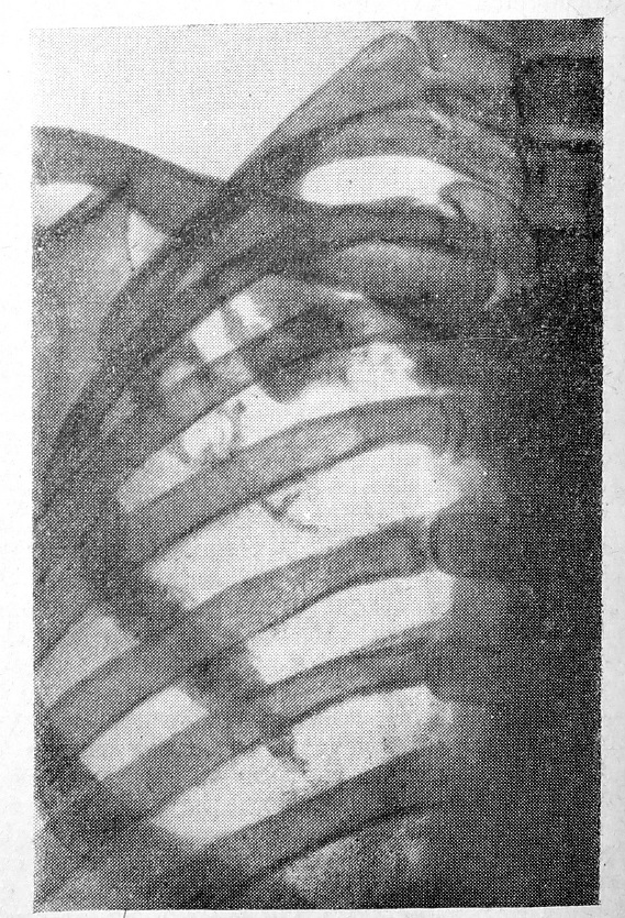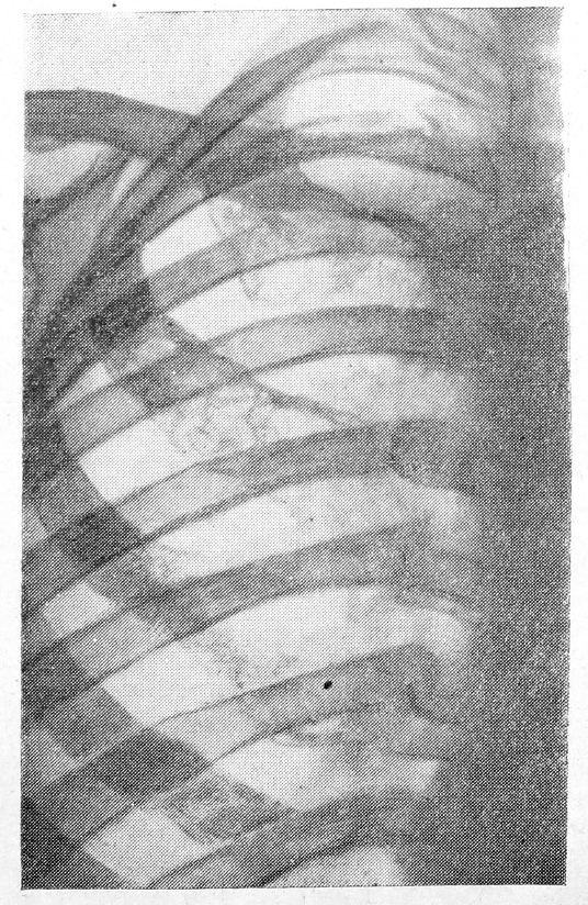 У трех больных с поражением ребер клинически отмечалась выраженная болез­ненность и утолщение мягких тканей по ходу ребер, соответственно чему рентгено­логически определялось умеренное вздутие ребер с нарушением трабекулярной структуры в ферме ноздреватых очагов неправильной формы, разных размеров, не имеющих ясных контуров и местами сливающихся между собой. У двух больных с изменениями в ребрах была разлитая болезненность по ходу ребер без уплотнения в мягких тканях; на рентгенограммах же и при рентгеноскопии определялась крае­вая деструкция ребра с наличием тени средней интенсивности неправильно округлой формы (нижний контур которой связан был с пораженной частью ребра).