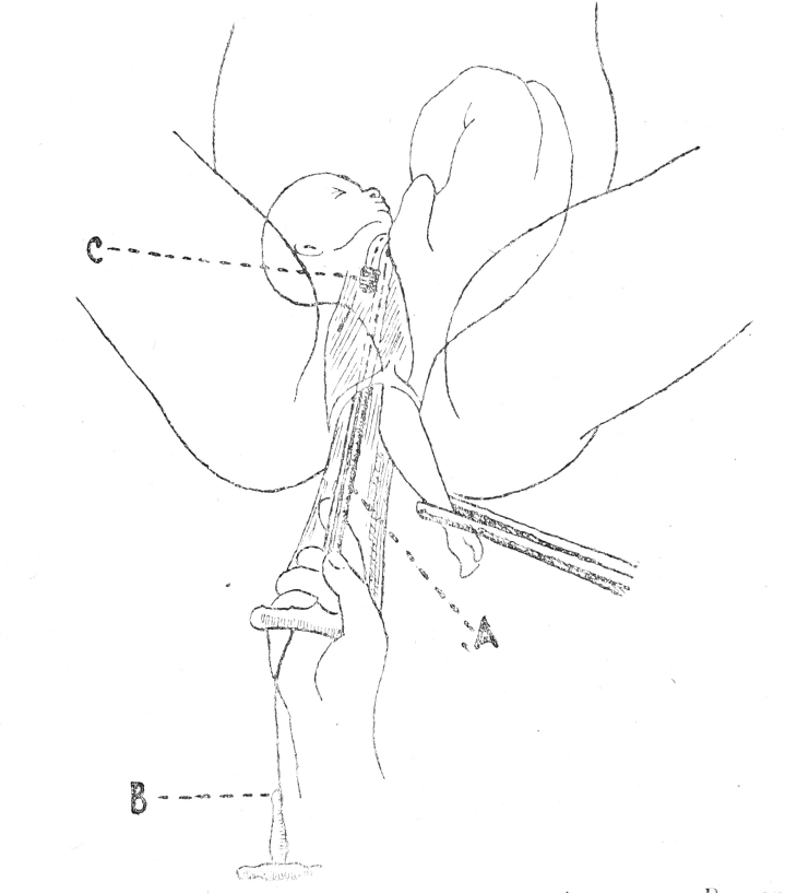 Наложенный декапитатор на шею плода. А—крючок. В—первый конец проволоки, заложенный в рейке крючка. С- штифт, на котором укреплен второй конец проволоки.