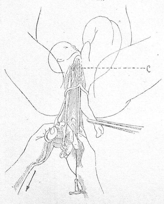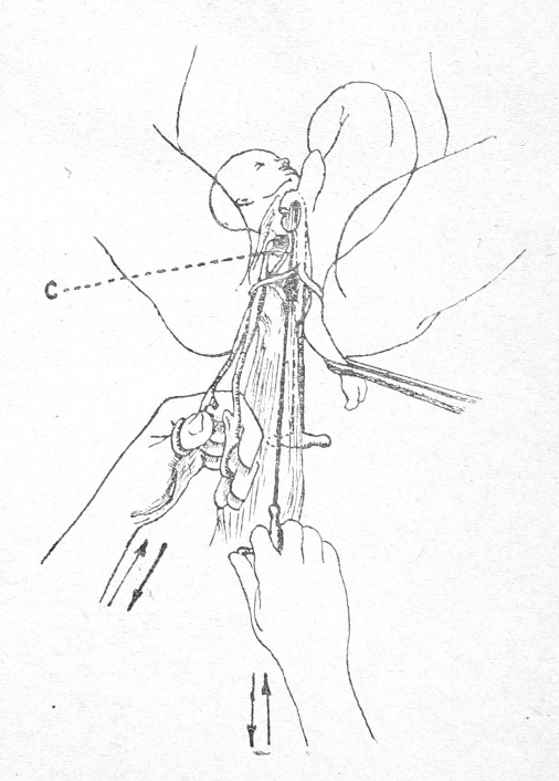 С вложенной проволочкой в выемку крючок Брауна вводится на шею плода по всем правилам этой операции. Не делая после введения никаких движений крючком (рис. 2), оператор захватывает штифт „C“ пулевыми щипцами либо другим инструментом. Штифт «С» извлекается (рис. 3) наружу, а за ним следует проволочка, при чем крючок Брауна остается на месте. Оба конца проволоки акушер берет в руки, 3—4 пиловидными движениями декапитирует головку, после чего проволока выпадает и крючок без труда вынимается В дальнейшем операция заканчивается как обычно.