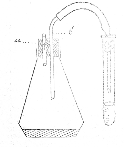 Для этой цели мы заменили иглу Дюффо иглою с диаметром троакара и вместо смазывания вазелином проводящей системы перед взятием крови стали увлажнять ее цитратом. Таким образом зарядка прибора по нашему способу заключается в следующем. В стандартную посуду Ц.И.П К., емкостью в 100 - 250 к. см, или в обычную колбу (рис.), наливается 10 к. см 6% цитрата, и сосуд закрывается плотно резиновом пробкой. В пробку предварительно вставлены две стеклянные трубки, из которых одна прямая короткая (а) вкладывается с таким расчетом, чтобы наружный конец ее выходил на 0,5 см выше пробки. Просвет этой трубки рыхло тампонируется ватой, что предупреждает попадание воздушной инфекции в колбу и обеспечивает выход воздуха из сосуда при наполнении его кровью. Вторая трубка (в) длинная, изогнутая, стеклянная продвигается в сосуд до предполагаемого уровня крови. К наружному концу ее присоединяется резиновая трубка длиной 15 см, на противоположный конец которой насаживается игла с диаметром троакара (к сожалению, такие иглы могут изготовляться до сих пор только кустарным способом). Игла у места соединения с резиновой трубкой туго обвертывается ватой и с этой ватной пробкой вставляется в пробирку, наполненную на ¼ объема стерильным цитратом (пробирка предварительно обрабатывается так же, как и колба), как это изображено на рис.