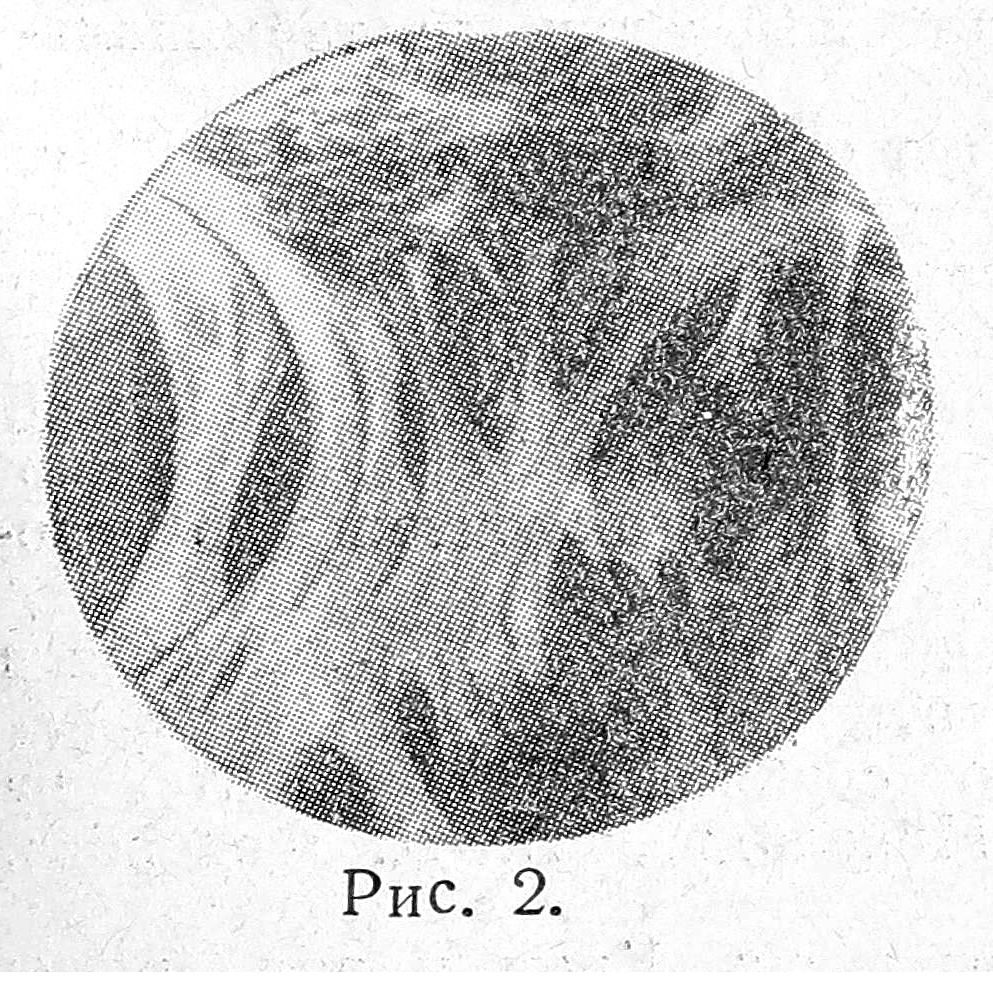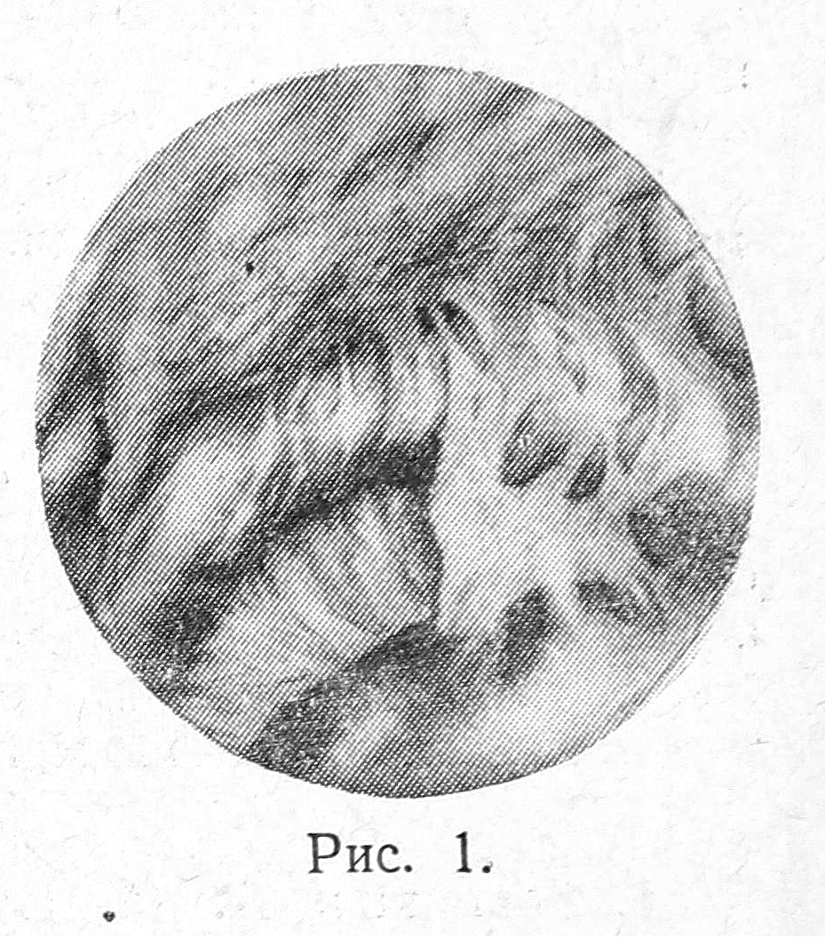 22/ІѴ-63 г. под общим интубационным эфирно-кислородным наркозом с применением релаксантов произведена лапароскопия. В брюшную полость введено 3,5 л воздуха. На 3 см левее и ниже пупка произведен прокол брюшной стенки. Через канюлю троакара введен торакоскоп. Обнаружены значительные сращения петель тонкого кишечника между собою и с передней брюшной стенкой. Несколько петель подвздошной кишки уходили в сторону малого таза, где были фиксированы. При положении Тренделенбурга петли не выходили из полости малого таза. Таким образом, выявились массивные сращения, преимущественно в нижнем отделе брюшной полости. Были видны плоскостные, тяжевые спайки, сальниковые спайки, сращения между кишечными петлями, а также между петлями кишок с передней брюшной стенкой, единичная спайка в виде тяжа между передней брюшной стенкой и петлей тонкого кишечника (рис. 2).Произведена срединно-нижняя лапаротомия под интубационным эфирно-кислородным наркозом. Подвздошная кишка многочисленными разнообразными спайками деформирована и фиксирована к передней брюшной стенке по месту старого рубца. Две петли перегнуты в виде двустволки и плотно сращены между собою. Три петли подвздошной кишки плотно приращены ко дну матки. Все спайки и сращения с большими техническими трудностями разделены. Выполнена операция Нобля. В брюшную полость влито 192 ед. «лидазы», 500 000 ед. пенициллина и стрептомицина. Рана брюшной стенки послойно ушита до резиновой трубочки, вставленной в брюшную полость, через прокол трубочки на протяжении 4 дней внутрибрюшинно вводилась «лидаза».