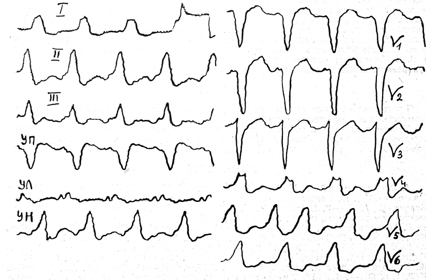 Рис.1 ЭКГ больного Б. от З/Ш 1963 г.: предсердная тахиеистолия с атриовентрикулярной блокадой и блокадой левой ножки пучка Гиса.
