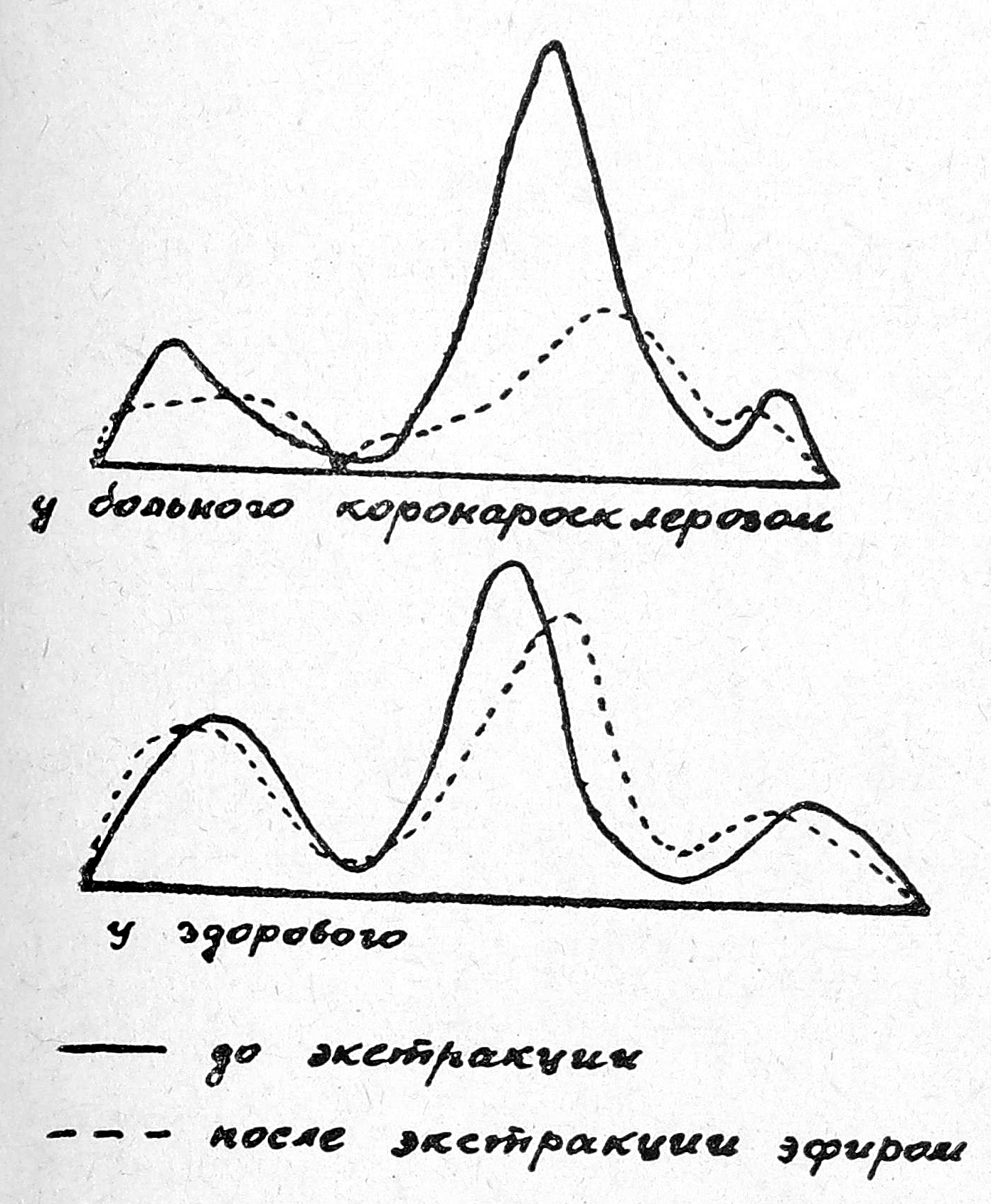 Оказалось, что коэффициент экстракции липидов из а-липопротеинов у 12 обследованных больных коронаросклерозом равняется 40%, а коэффициент экстракции липидов из в-липопротеинов — 64,5%. У 22 больных инфарктом миокарда коэффициент экстракции «-липопротеинов составляет 35,4%, а коэффициент экстракции в-липопротеинов— 50,2%. Отсюда можно сделать вывод, что коэффициент экстракции липидов из липопротеинов в обеих фракциях при первой стадии коронаросклероза больше, чем при второй.