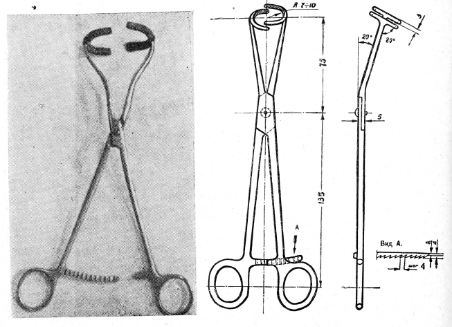 Созданные на внутренней поверхности полукругов насечки предупреждают соскальзывание зажима с шейки матки. С этой же целью на дуги зажима могут быть надеты резиновые трубочки. Перед наложением зажима шейка матки должна быть очищена от слизи.