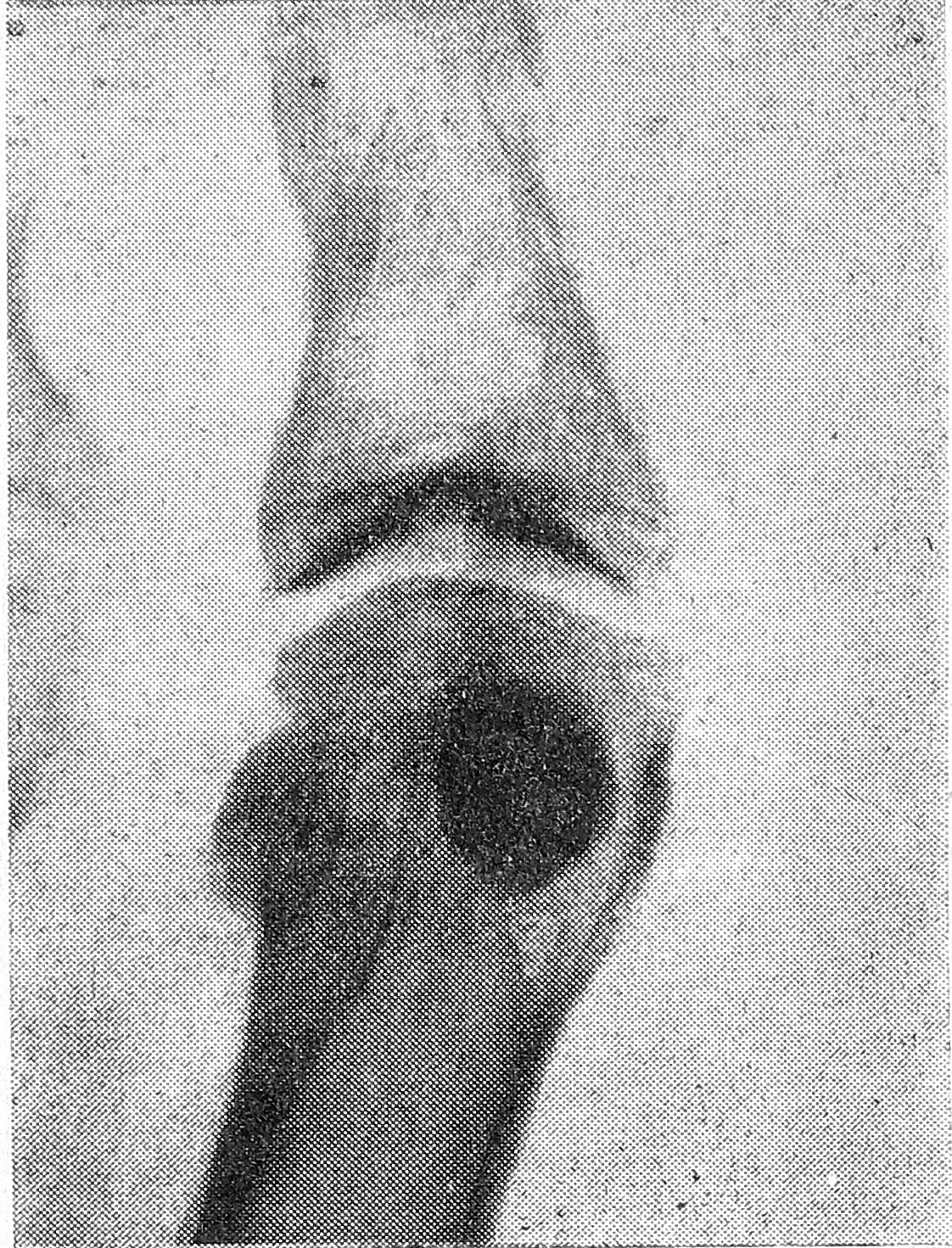 К., 40 лет, обратился 1/ѴІ 1960 г. с жалобами на боли в области первого пальца левой стопы. За несколько дней до их появления носил узкую обувь, сильно сдавливающую стопу.