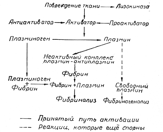 Шарп (1964) указывает, что хотя механизм фибринолиза на первый взгляд является простым, точный путь фибринолиза еще не совсем ясен. Он дает следующую схему механизма фибринолиза (см. рис. 1 на стр. 51).
