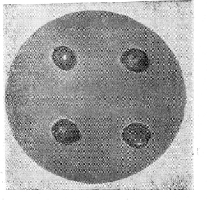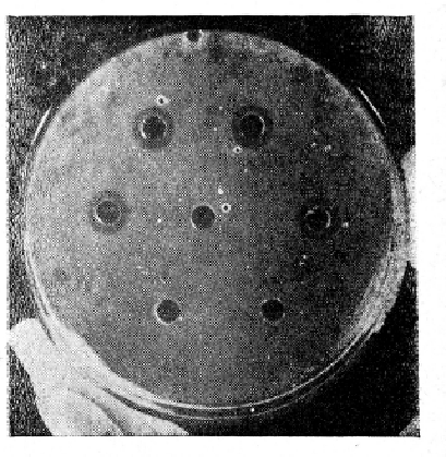 Для получения фибрин-агаровых пластинок мы смешивали 0,6% раствор фибриногена с 1,5% раствором агара в соотношении 1:4. 15 мл раствора фибриногенагара смешивали в колбочке с 0,5 мл раствора тромбина 40 ед./мл активности и быстро переносили в чашку Петри. На фибрин-агаровом слое делали 6 лунок диаметром 6 мм. Исследуемый субстрат в количестве 0,03 мл наносили на поверхность фибринового слоя или в лунки фибрин-агаровой пластинки и ставили в термостат при температуре 37°. Определение фибринолитической активности производили измерением зон лизиса. Измеряли 2 взаимно перпендикулярных диаметра с помощью штангенциркуля. Полученный результат выражали в квадратных миллиметрах. Активность каждого субстрата определяли в трех зонах и выводили среднее число. Зоны лизиса можно сфотографировать путем непосредственного контакта светочувствительной бумаги с чашкой Петри. Такой способ применен нами для гретых пластинок, где зоны лизиса видны в виде темных пятен (рис. 2). Можно сфотографировать фотоаппаратом, как мы поступили с фибрин-агаровыми пластинками, где зоны лизиса четко и ясно видны вокруг лунки в виде темного ореола (рис. 3). При отсутствии фибринолитической активности зоны лизиса нет, а в фибриновом слое видны участки помутнения на месте нанесенного субстрата.