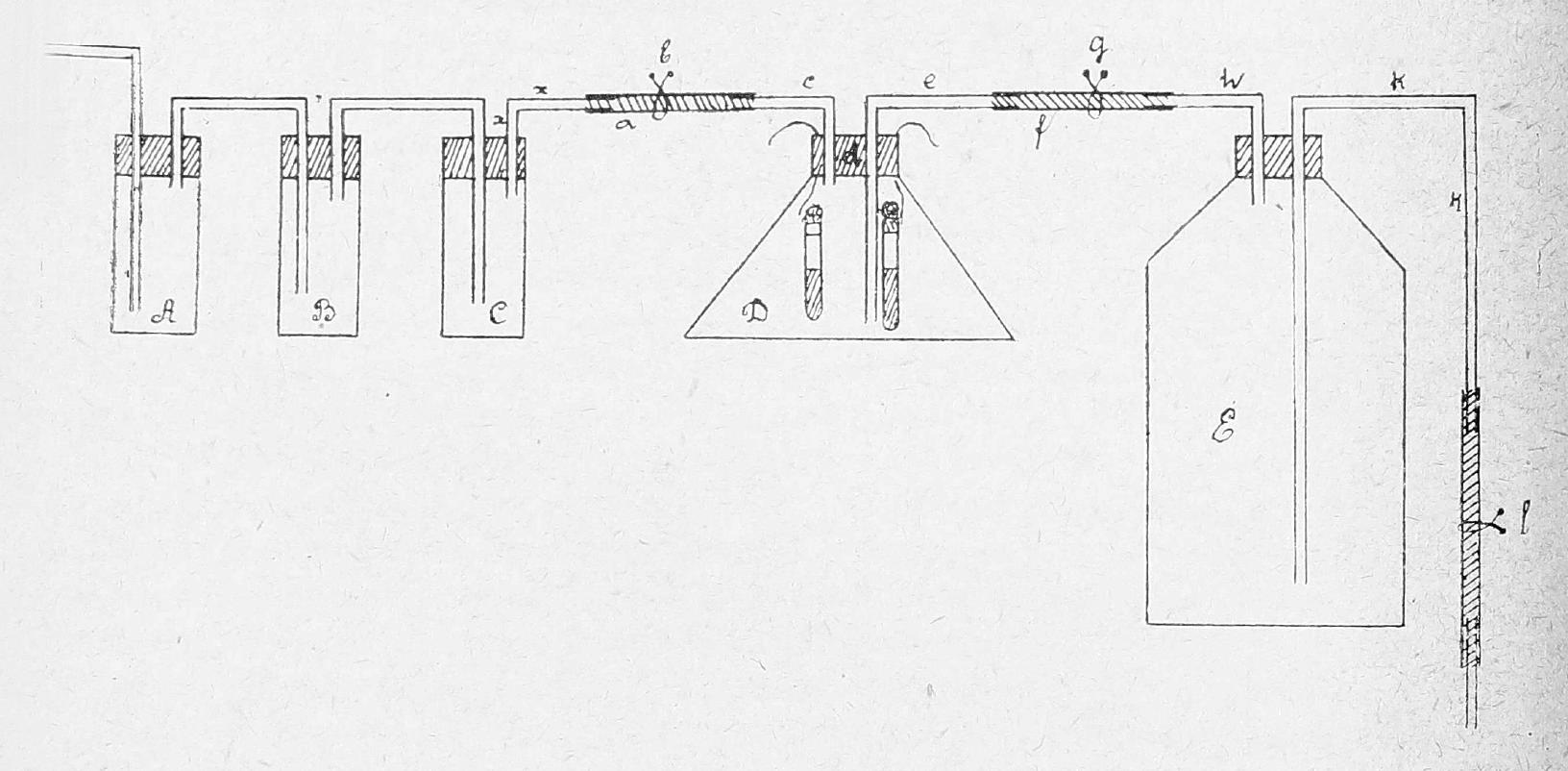 3 промывные склянки А, В и С (см. рис.), наполовину наполненные 30% раствором едкого калия, соединены при помощи резиновой трубки a, снабженной зажимом b, со стеклянной трубной c, проходящей через резиновую пробку a колбы Д, емкостью в 3 литра. Через ту же пробку проходит стеклянная трубка е, которая соединена, при помощи резиновой трубки f, снабженной зажимом g, со стеклянной трубкой h, проходящей через пробку бутыли Е, емкостью в 10 литров. Колба Д наполнена вся водой, бутыль Е — на три четверти. Изогнутая трубка k, предварительно наполненная водой и запирающаяся зажимом е, служит сифоном. При открывании зажима е вода медленно вытекает из бутыли Е через трубку k, и взамен ее в бутыль присасывается вода из колбы Д, а взамен этой последней в колбу Д протягивается воздух, проходящий предварительно через промывные склянки. Когда вода наполовину вытечет из колбы Д, мы закрываем зажим l, чем прекращается действие сифона. Тогда мы вынимаем из колбы Д резиновую пробку и опускаем туда 2 пробирки на нитках: одну пробирку со средой k с посевом, другую — с прозрачной известковой водой, после чего закрываем пробкой колбу и опять открываем зажим l. Вода из колбы Д медленно переходит в бутыль Е. После того, как вся вода из колбы Д вытечет, на место вытекающей воды из бутыли Е туда будет присасываться воздух из колбы Д, который в свою очередь заменится воздухом, проходящим через склянки А, В и С. Пробка d колбы Д и отверстия в ней, через которые проходят трубки с и е, заливаются параффином. После того, как почти вся вода вытечет из бутыли Е, зажимы b и g закрываются, резиновые трубки снимаются с трубок х и h, и колба ставится в термостат. Через стенку ее видно, что известковая вода не мутнеет, и это свидетельствует о том, что в колбе Д воздух не содержит CO2. Контрольная пробирка с посевом ставится в колбе, закрытой резиновой пробкой, рядом в термостат. Каждые 24—36 часов колба Д соединяется с промывными склянками и бутылью Е, наполненной водой, вода выпускается из бутыли и замещается воздухом, проходящим из колбы Д, которая в свою очередь заполняется воздухом, проходящим через промывные склянки. Таким образом обновляется в колбе Д воздух. Известковая вода в пробирке не мутнеет. В контрольной колбе резиновая пробка каждый раз вынимается на такое же время, тоже для обновления состава воздуха. Через, 12—14 дней колба открывается, и тогда можно убедиться, что в то время, как в контрольной пробирке поверхность среды покрыта тонкой пленкой в виде холестеринового налета, которая поднимается по стенке пробирки, в опытной пробирке на поверхности роста нет (при условии посева на поверхность среды). В известковой воде образуется иногда на поверхности белый тонкий налет, вся же вода прозрачна. При встряхивании на воздухе она мутнеет. Под микроскопом в мазке из пленки мы видим, что имеем дело с чистой культурой кислотоупорных палочек tbc.