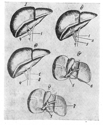 I вариант: общий печеночный проток (1) образуется дихотомически из слияния двух протоков, задне-ниж­ний проток правой доли (4) впадает в общий печеноч­ный (1); II вариант: в общий печеночный проток (1) впадают передне-верхний (3) и задне-верхний (5) про­токи правой доли; III вариант: задне-нижний прогок правой доли (4) впадаёт в желчный проток (8); IV ва­риант: в общий печеночный проток (1) впадает желч­ный проток квадратной доли (6); V вариант: в общий печеночный проток (1) впадает желчный проток хво­статой доли (7).