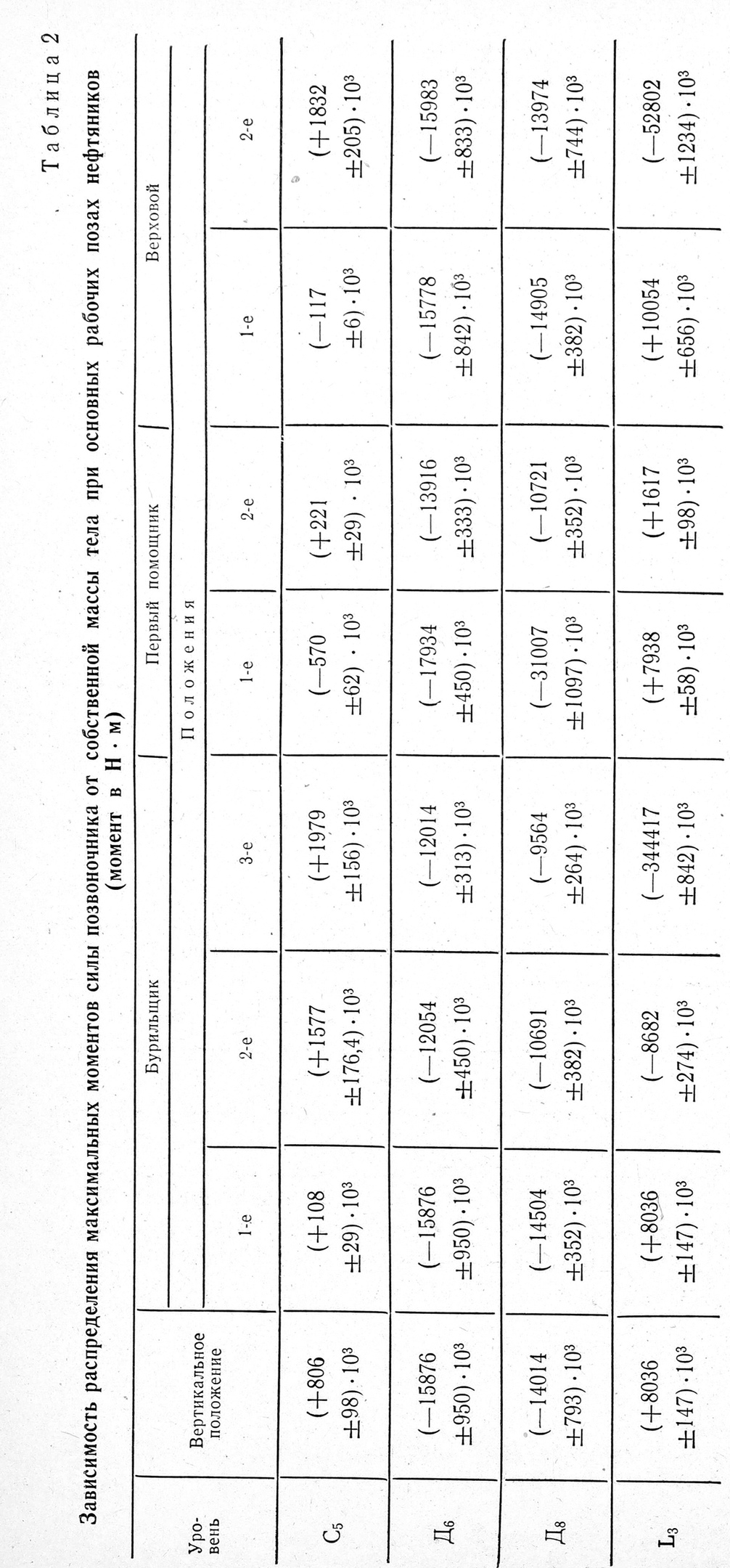 (табл. 2) свидетельствуют, что в рабочей позе бурильщика наибольшие моменты силы возникают в 3-м положении (на уровне шейного лордоза — в 2,4 раза, на уровне поясничного лордоза— в 5,3 раза большие, чем при вертикальном положении), в рабочей позе первого помощника 'бурильщика — в 1-м положении (в шейном отделе — в 1,7 раза, в грудном — в 1,1—1,2 раза большие), а в рачей позе верхового — во 2-м положении (в шейном отделе — в 2,3 раза, в поясничном — в 6,57 раза большие, чем при вертикальном положении).
