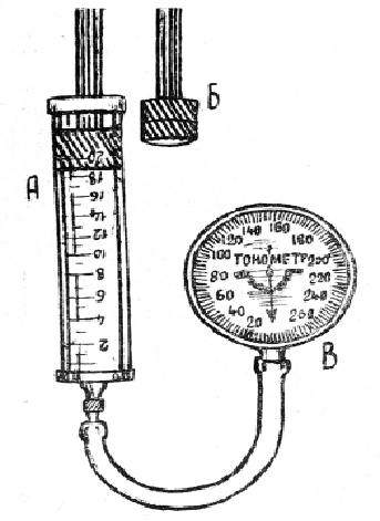Основными составными частями цервикотонометра являются цилиндр 20-граммового шприца типа Рекорд (А), его поршень, соединенный с рукояткой расширителя Гегара (Б), и манометр (В). Манометр соединяется со шприцем с помощью резиновой трубки.