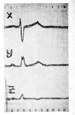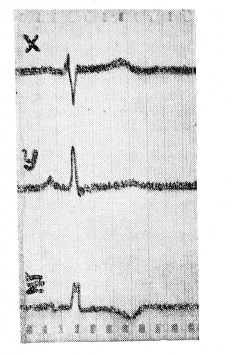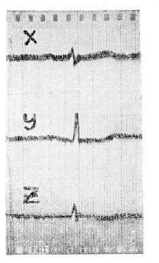 На рис. 1 представлена ЭКГ в ортогональных отведениях больного С., 17 лет, страдавшего комбинированным митральным пороком с преобладанием стеноза. Диагноз был подтвержден при операции. На кривой можно отметить увеличение зубца Sx (7 мм), снижение зубца Sz (0,2 мм), увеличение Sx+ Rz (17 мм), а также отношения Rz/Sz (35), уменьшение индекса I (0,31), снижение точки Jz и отрицательный зубец Т.
