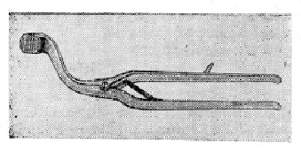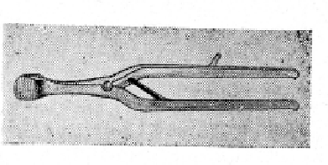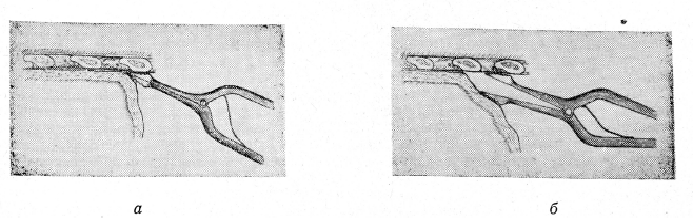 Нами сконструирована модель плеврального диссектора, в которой принцип работы аппарата Богуша осуществлен по-другому. Плевральный диссектор нашей конструкции отличается простотой изготовления и применения. Он состоит из двух браншей, соединенных при помощи шарнира. Между браншами диссектора вмонтирована пластинчатая пружина, удерживающая бранши в разомкнутом положении. При сближении рукояток происходит раздвигание проксимальной — рабочей части инструмента. Последняя состоит из двух полуовальных лопастей, прикрепленных к браншам диссектора. На лопасти нанесена поперечная накатка. В сомкнутом положении лопасти представляют ромбовидной формы образование с закругленными краями. Такой формы рабочую часть инструмента можно легко вводить в ткани. Изготовлены прямая (рис. 1) и изогнутая (рис. 2) модели плеврального диссектора. Для изготовления плеврального диссектора нашей конструкции можно использовать реберные кусачки или другой подобный инструмент.