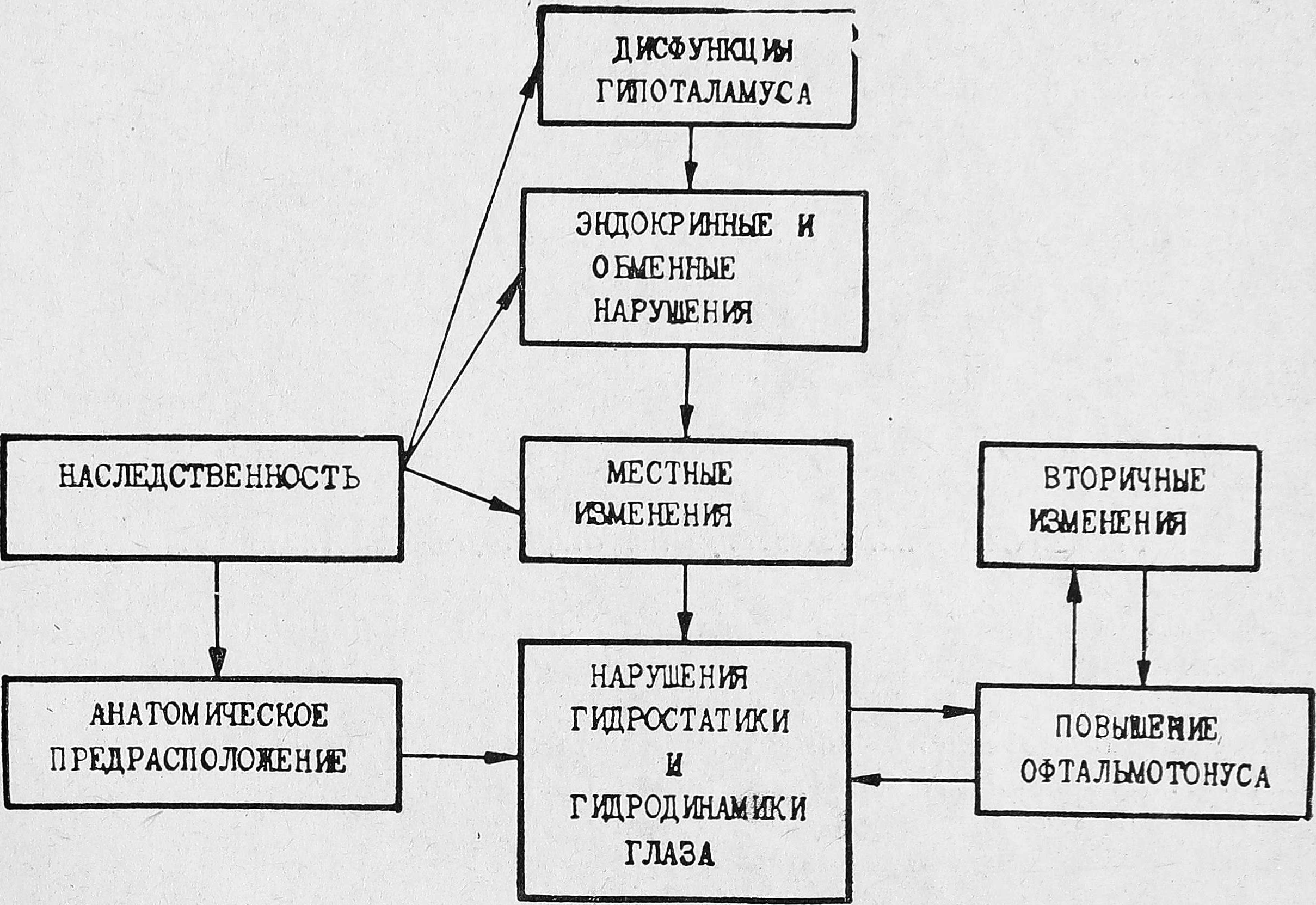 Рис. 1. Общая схема патогенеза первичной глаукомы.