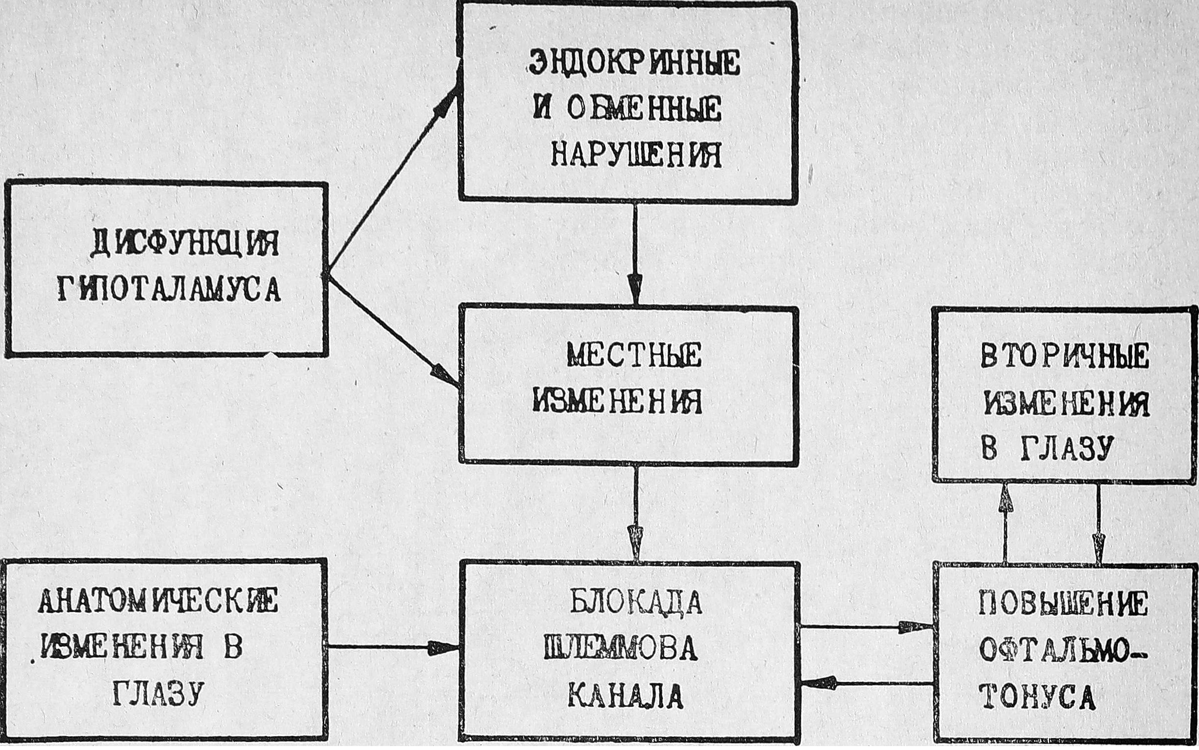 The literature on the pathogenesis of primary glaucoma is extremely extensive, and there are a wide variety of, often totally conflicting, views. A wealth of evidence has accumulated describing the general state of the body in glaucoma patients and the local changes in the eye. The individual parts of the pathogenesis of the glaucomatous process, especially of closed angle glaucoma, have been studied in detail. However, there is currently no general theory of pathogenesis that satisfactorily explains all of the above key facts. Below we present a concept which we have reported and discussed at the joint meeting of the Problem Commission for Ophthalmology of the RSFSR Ministry of Health and the Scientific Council of the Moscow Helmholtz Moscow Research Institute of Eye Diseases in May 1970.