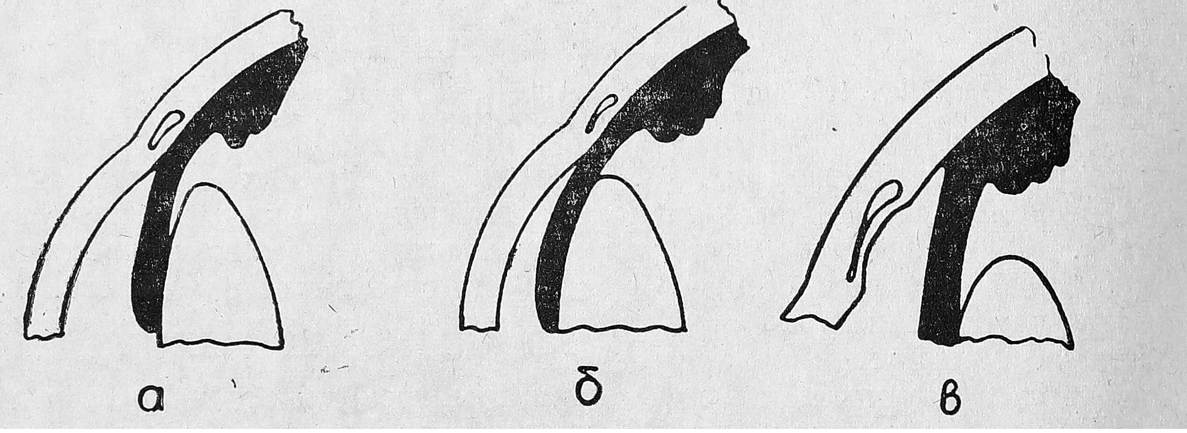 При простой глаукоме смещение диафрагмы выражено столь значительно, что на отдельных участках просвет синуса полностью закрывается (рис. 3, в). Такое состояние мы и назвали наружным блоком в отличие от внутреннего, который наблюдается при глаукоме закрытого угла.
