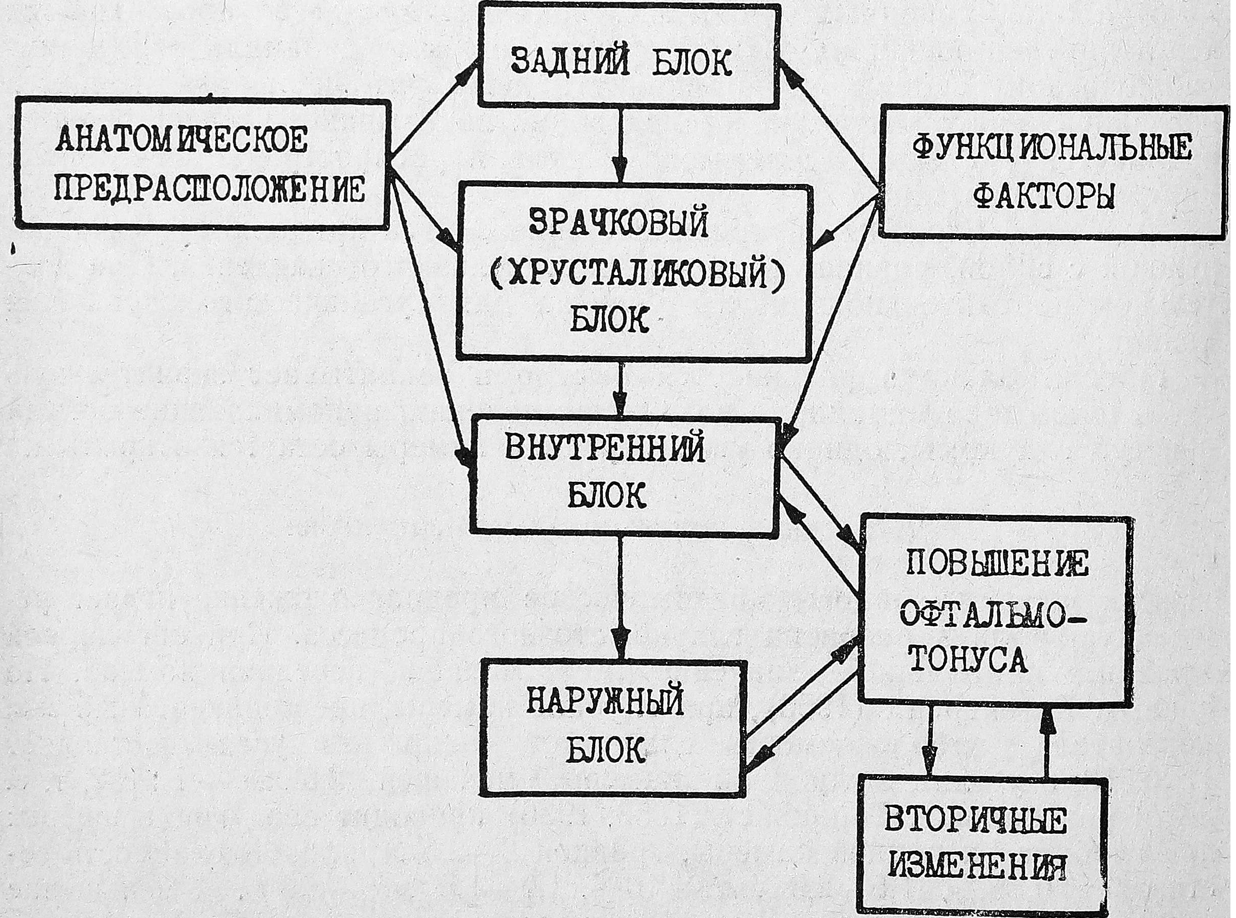 Рис. 4. Схема патогенеза закрытоугольной глаукомы.