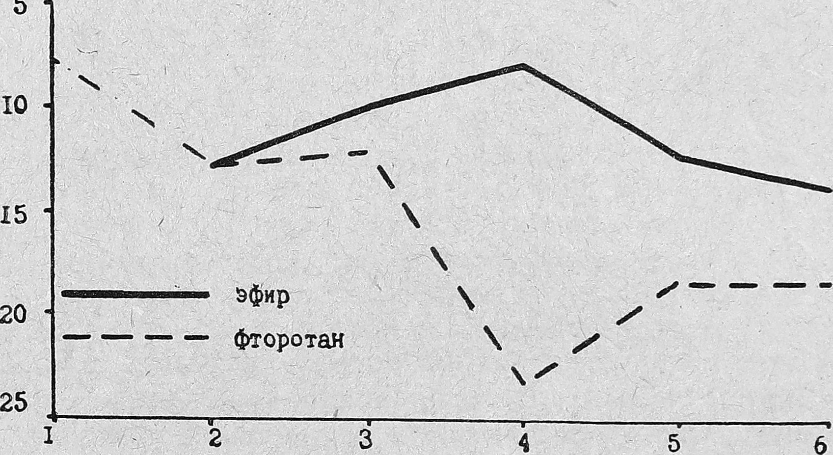 Рис. 2. Изменения тонуса периферических вен у больных гипертонической болезнью во время эфирного и фторотанового наркоза (по данным плетизмографии).