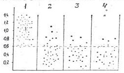 Показатели опсонической активности альтернативного пути активации комплемента: / — у здоровых детей, 2 — у больных острым необструктивным пиелонефритом, 3 — у больных хроническим необструктивным пиелонефритом, 4 — у больных хроническим обструктивным пиелонефритом. Черточками указаны средние показатели АПАК, точками — индивидуальные значения.