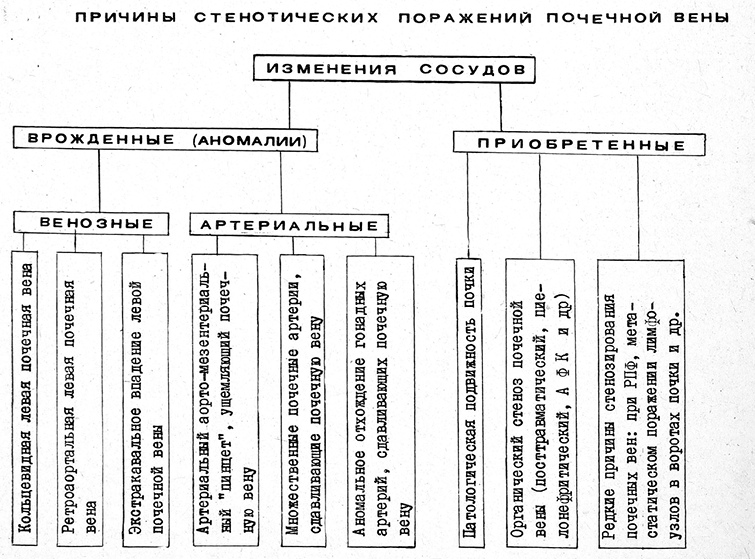 Среди причин стеноза почечной вены (см. схему) мы выделяем врожденные и приобретенные, а также изменения самих почечных вен, обусловливающие венозный застой в почке, и изменения артерий, приводящие к нарушении оттока по почечным венам. Эта классификация удобна для установления диагноза, хотя не претендует на ее полноту.