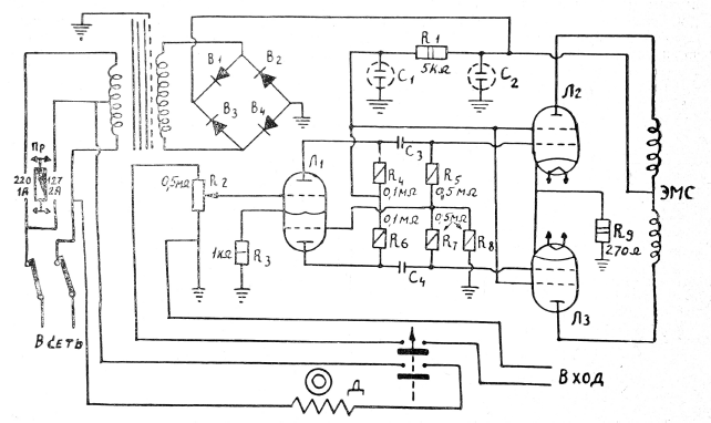 Условные обозначения: В1—4 — полупров. диод. ДТГ; С1—2 — конденсатор КЭ-2-450-20М; C3-4 —конденсатор 0,1 мкф 200в: Л1 — 6Н9С, Л2-3 — 6П9; ЭМС — электромагнитный самописец; Д — двигатель.